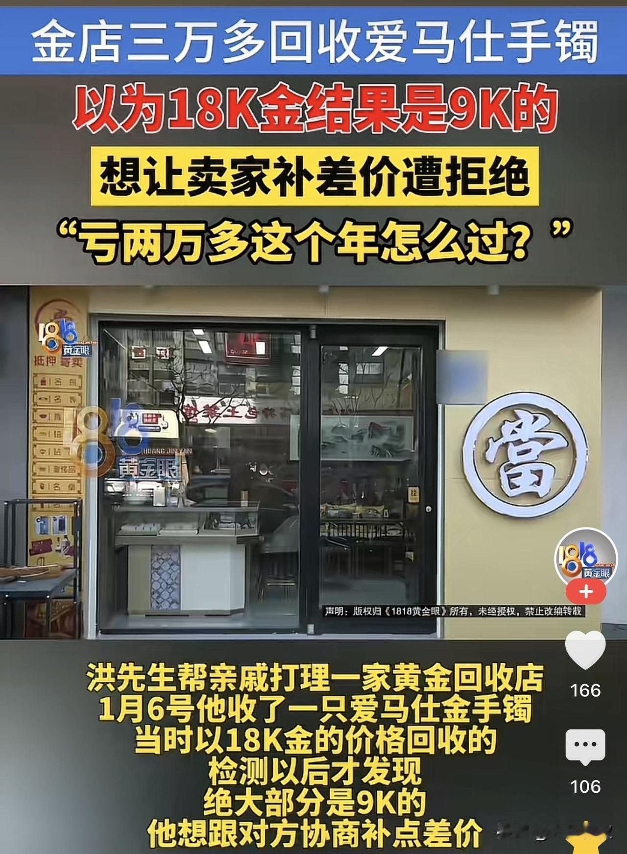 浙江绍兴,一男子开了一家黄金回收店,前不久,一名客户送来一款奢侈品金手镯,男子以18K金的价格回收的,结果后来检测才发现,这款金手镯竟然是9K的,于是男子联系上客户希望对方补价差。不料网友却不愿意了表示,如果是按照24K收的,是不是就不说了? 洪先生帮亲戚打理着一家黄金回收店,店面虽然不大,但是店里的商品可谓琳琅满目,不仅有黄金、白银饰品,还有名烟、酒水等。 上个周的时候,洪先生店里来了一位顾客,顾客要卖一只奢侈品牌的手镯,因为这名顾客是曾经的老邻居,所以洪先生就没当一般顾客一样对待。 随后,洪先生随便验了一下确定是黄金后,就把钱转给了顾客。按照当天的金价999元,因为黄金含量是75%,最后便以38982元的价格收下了这款手镯。 之后,洪先生便将这款手镯送去检测,结果检查下来发现,这款手镯只是9K的黄金,原来,这款手镯的扣头是18K黄金,而手镯身却是9K的,所以才导致了洪先生自己检测失误的情况。 之后,洪先生联系上了顾客,希望顾客补偿价,顾客则表示,黄金手镯已经给你了,不同意补差价2万左右。 事发后,有网友就表示,你回收是专业的,自己打了眼就自负盈亏吗,如果这个手镯是24K的,你按照18K收的,回头你还能给顾客补差价吗? 也有网友说,人家这个品牌是卖牌子不是卖黄金,你按照克数收肯定亏本。 还有网友说,估计顾客买的时候才两三万吧,回收的时候快4万了,肯定愿意赶紧脱手。 那么,洪先生到底算是自负盈亏,还是说能够向顾客索要2万的差价? 其实,问题的关键就在于,洪先生是以什么样的含量回收的,是以24K还是18K还是9K回收的,直接决定了能不能要。 即如果就像洪先生自己说的那样,自己检测是18K金,但是实际上只是手镯头18K,身子是9K,那么洪先生按照整体18K回收的,就属于重大误解。 所谓的重大误解,就是行为人在对行为的性质、对方当事人以及标的物的品种、质量、规格和数量等方面的错误认识,使行为的后果与自己的意思相悖,并造成较大损失情况下而为的民事法律行为。 本案中,洪先生将9K误认为是18K金,显然是对质量方面发生了误解,而且造成了自己2万元左右的损失,在这种情况下,就属于重大误解。 民法典第一百四十七条规定,基于重大误解实施的民事法律行为,行为人有权请求人民法院或者仲裁机构予以撤销。 所以,洪先生只能申请法院或者仲裁予以撤销,自己想要撤销是撤销不了的。 但是,问题是这是一个奢侈品首饰,如果其二手价格在三四万的话,即便其含金量是9K的,那么,洪先生实际上也没有什么损失,这个情况下想要撤销,还是不可能的,除非这个首饰的二手价格很低,在这种情况下,才有撤销的可能性。 其实,很多网友觉得,是你自己打眼了就自负盈亏行了,怎么能再去找顾客呢? 对此,你对本案有什么看法? —————————— 关注我,带你评析法律热点,关注冷暖人生。 文章原创,抄袭必究