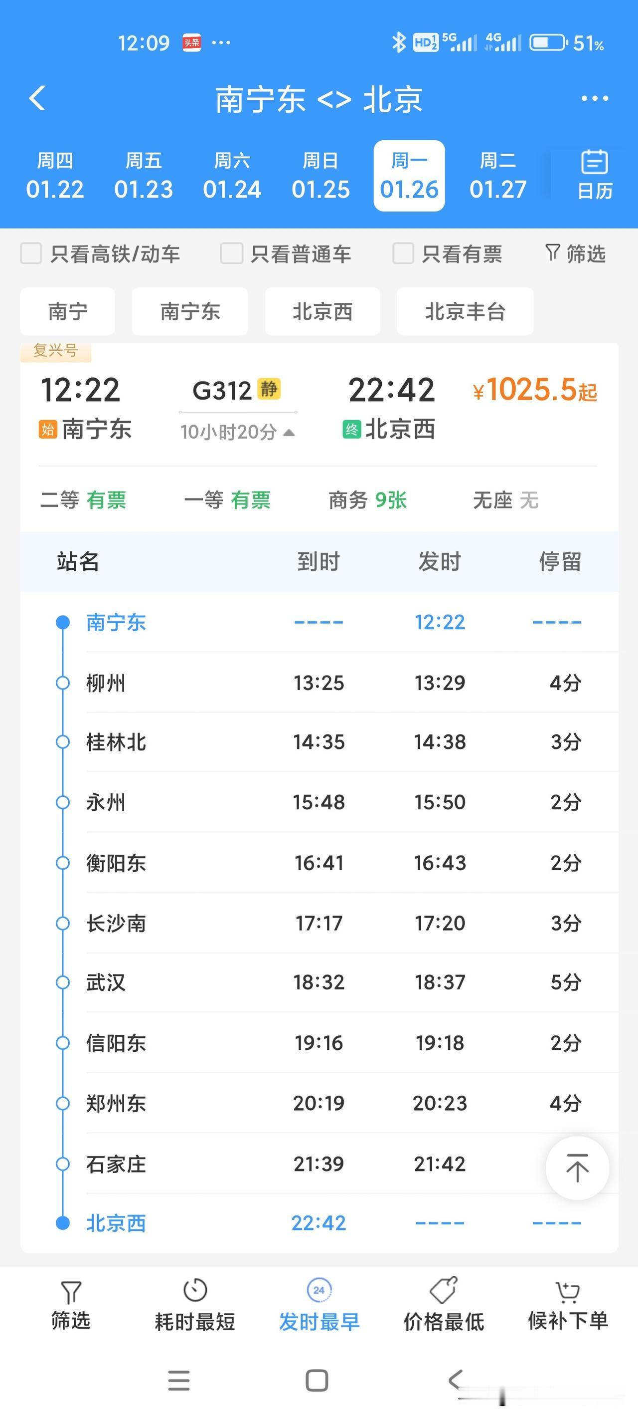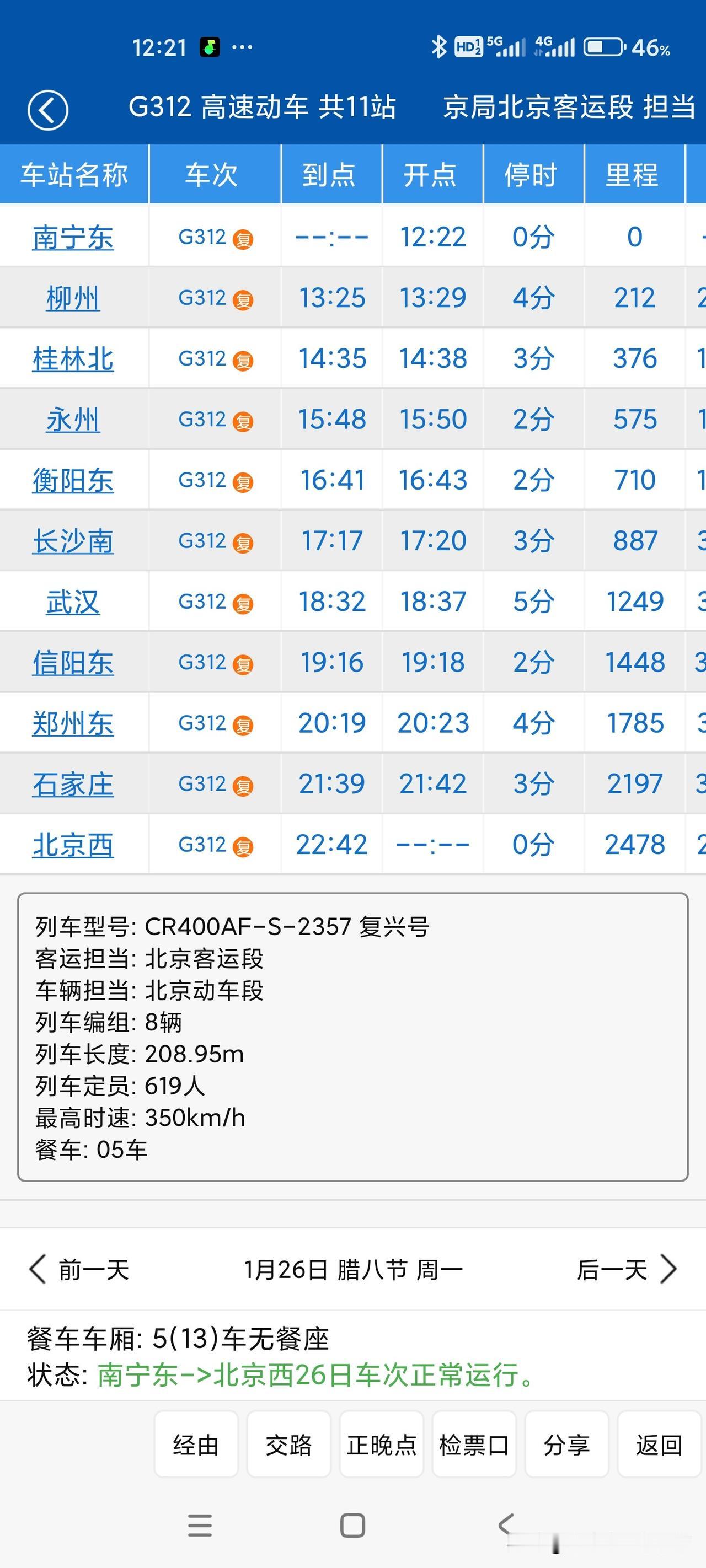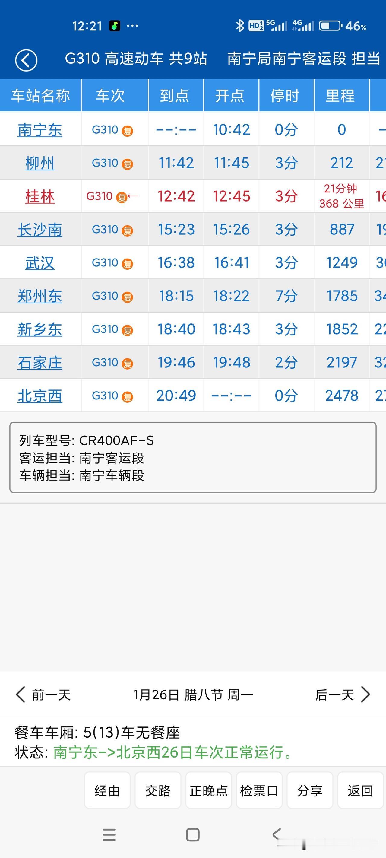 1月26日铁路调图后,广西进京两趟高铁G310,G312都是大站快车,时间都是10个小时多一点点,太赞了!
