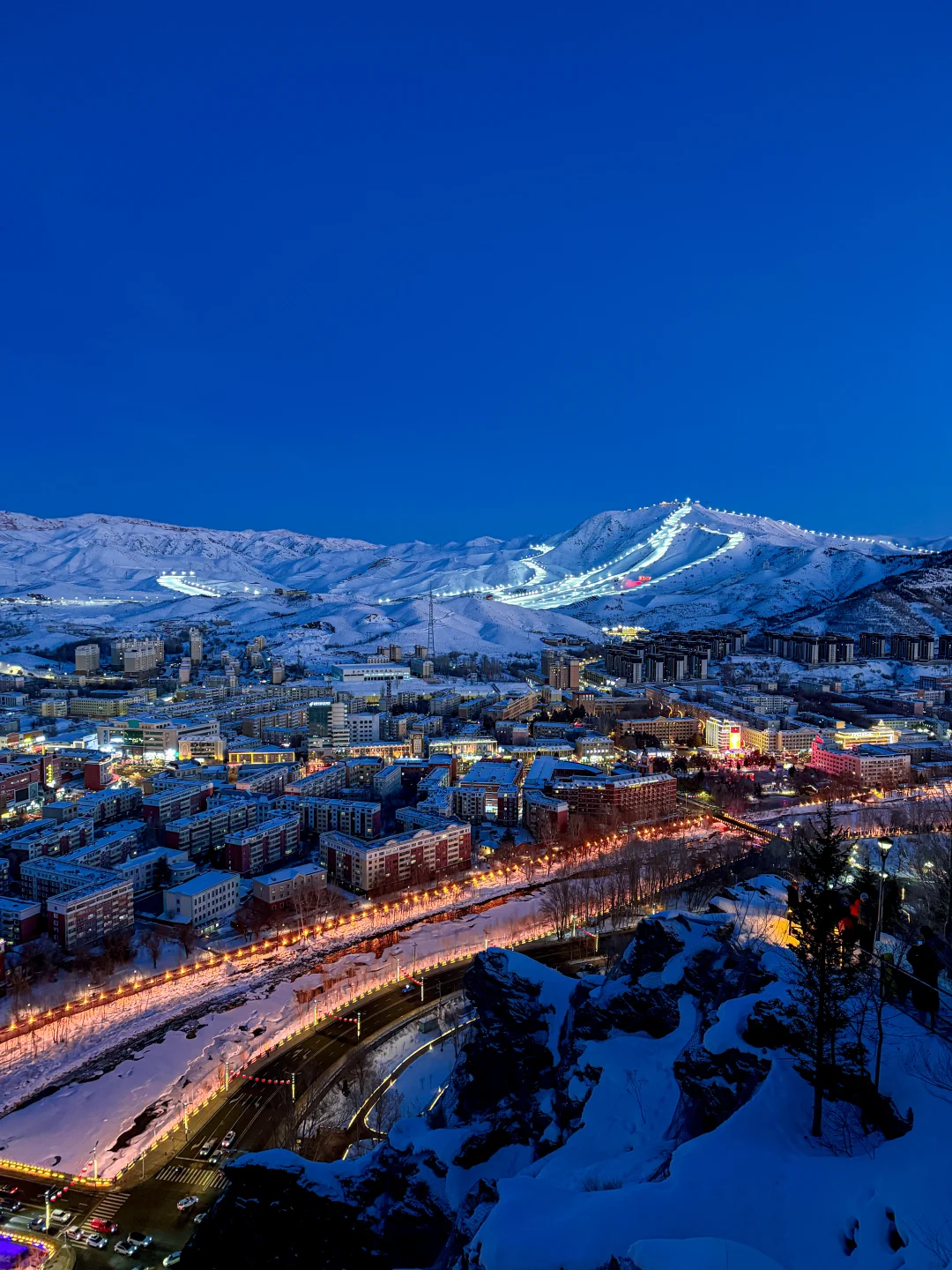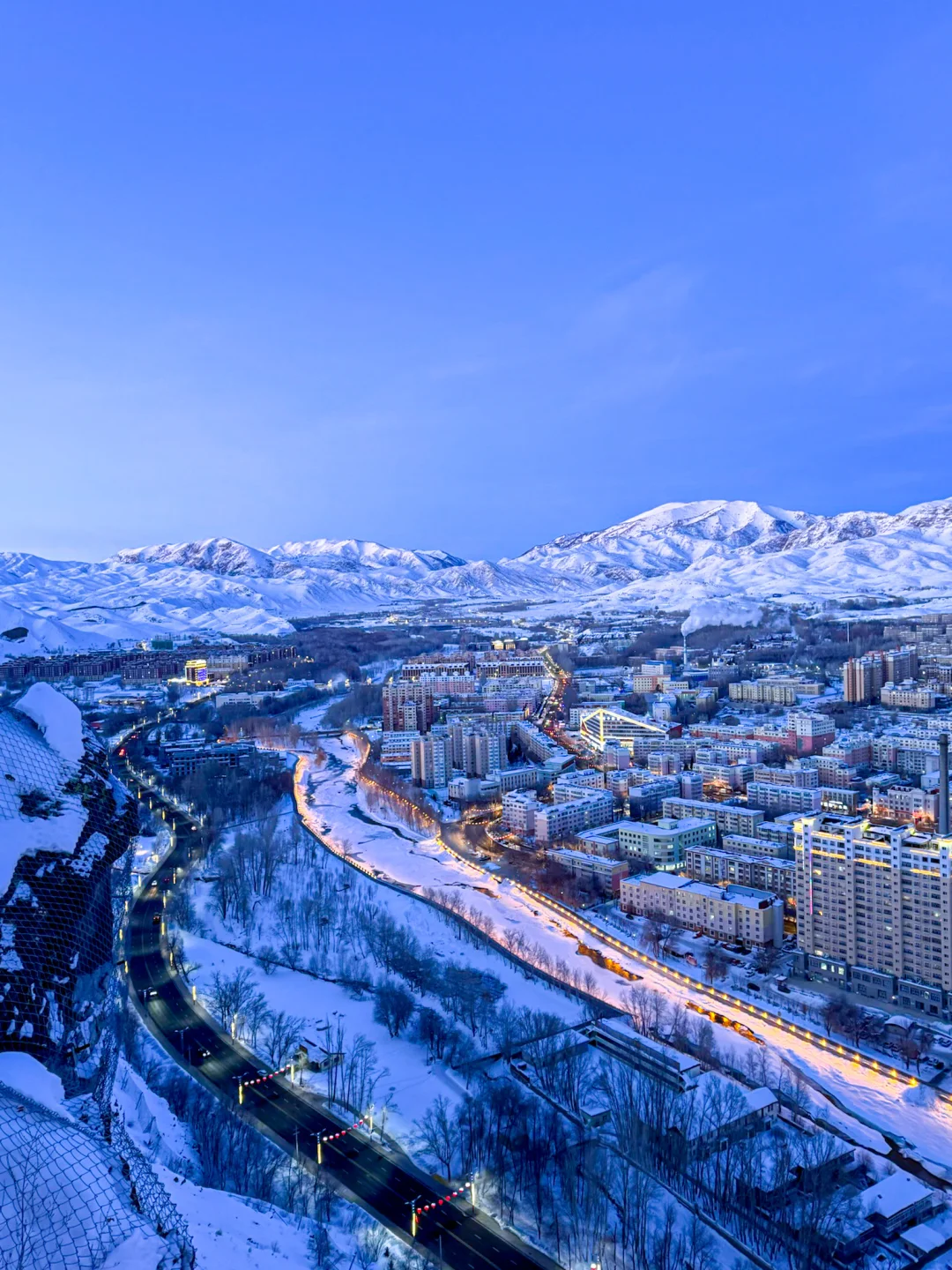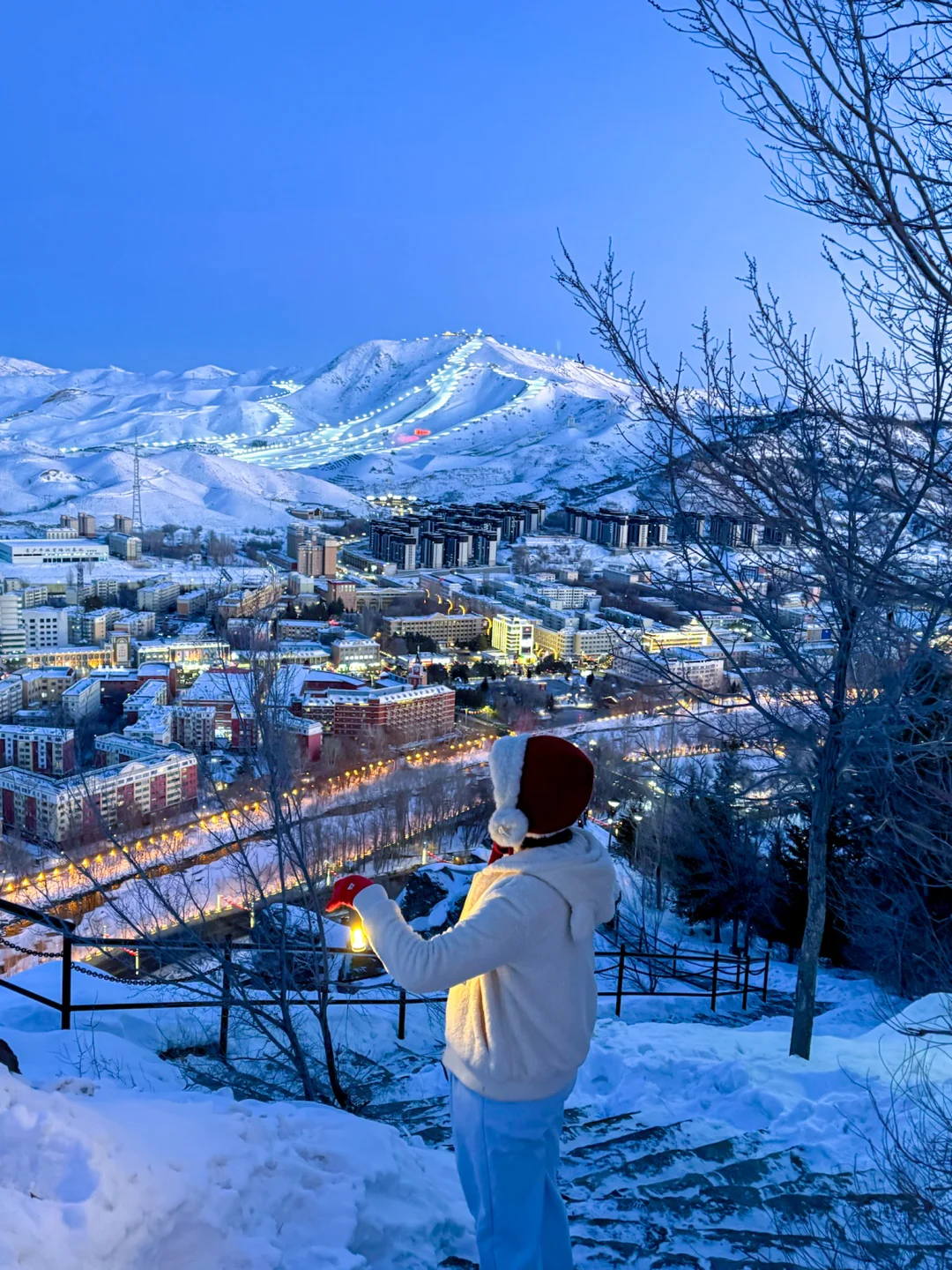 傍晚时刻来阿勒泰市区的驼峰山看晚霞和蓝调 在日落前,提前上山 俯瞰整个市区的灯火通明和将军山滑雪场的夜景 现在蓝调大概在19.30左右! 蓝调时刻很短,抓紧拍照 上下山约30分钟,走台阶上山 下雪后台阶很滑,可以带冰爪爬山