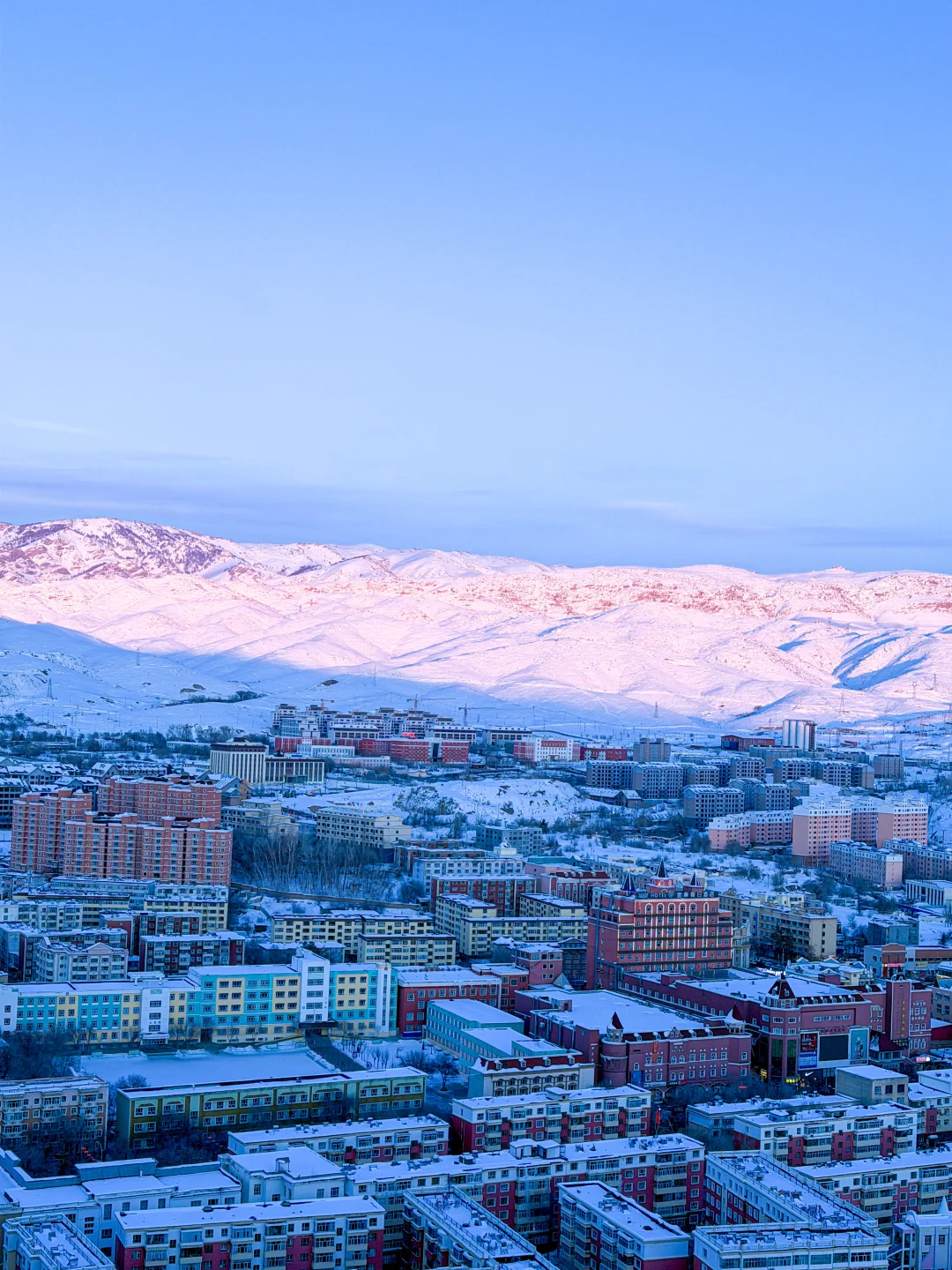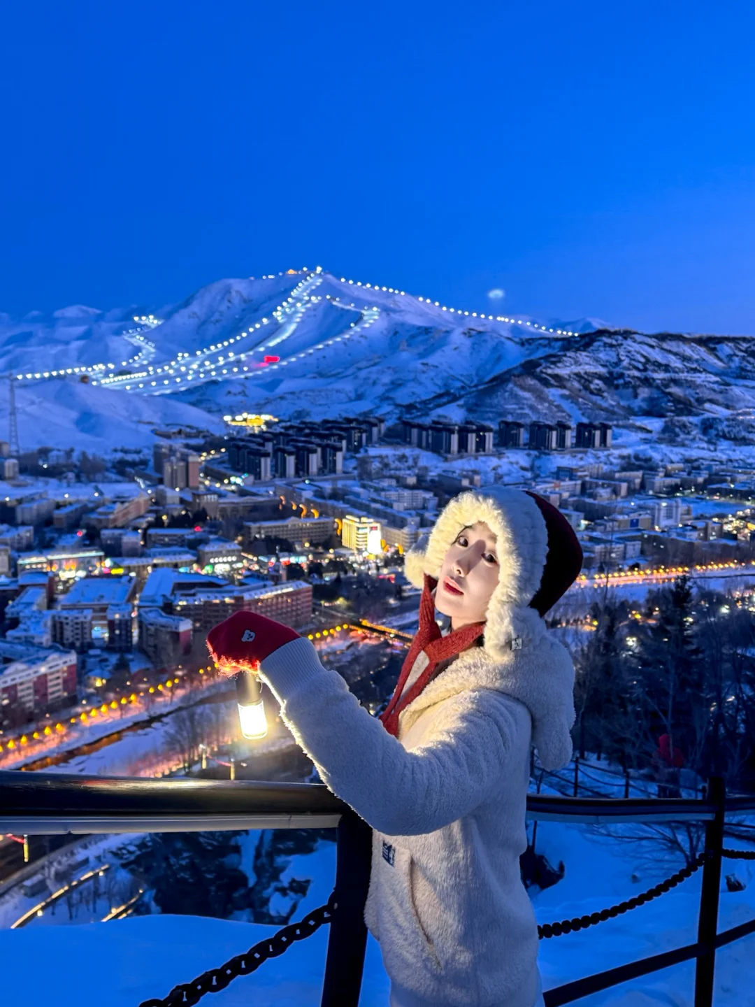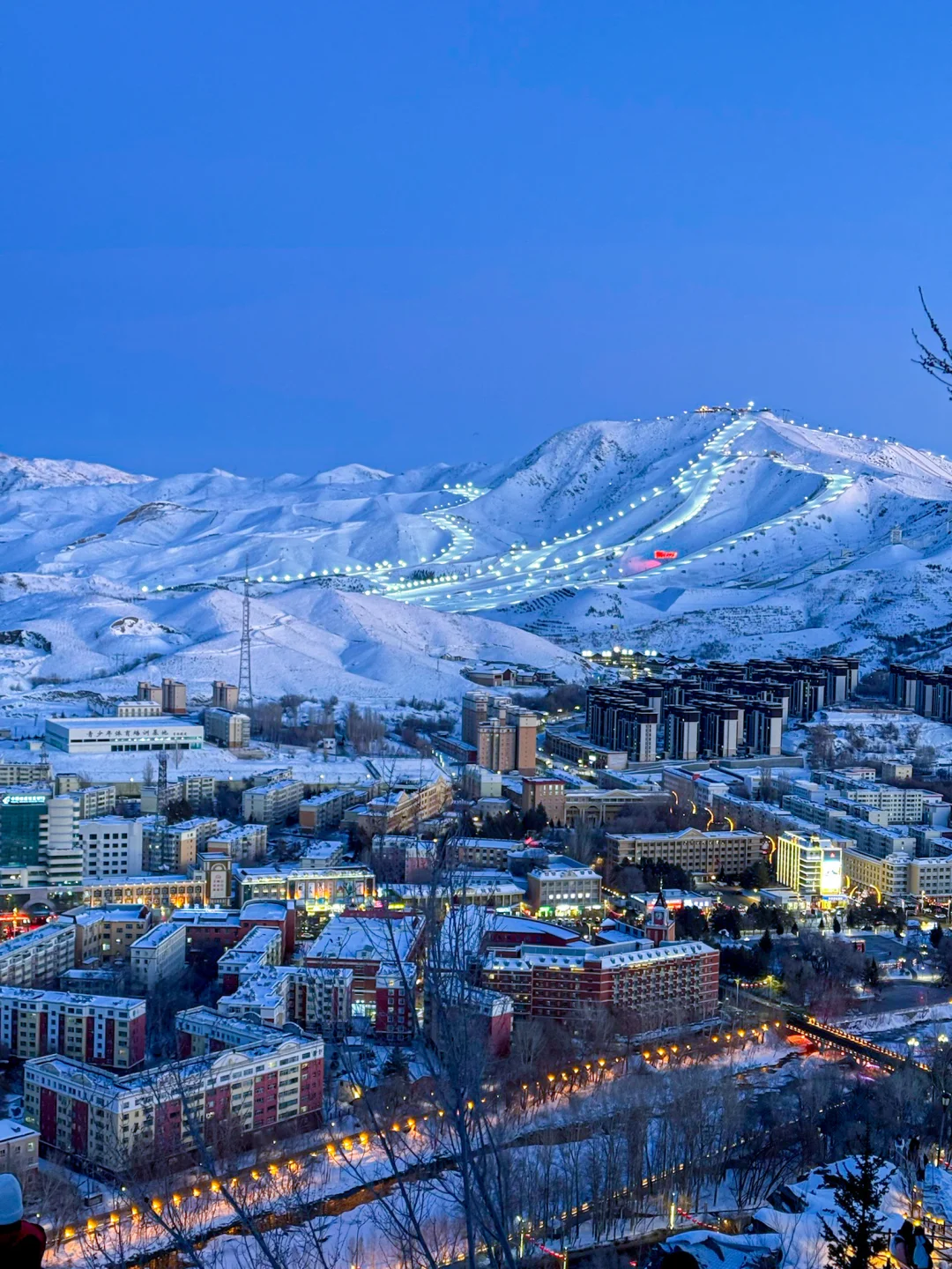 傍晚时刻来阿勒泰市区的驼峰山看晚霞和蓝调 在日落前,提前上山 俯瞰整个市区的灯火通明和将军山滑雪场的夜景 现在蓝调大概在19.30左右! 蓝调时刻很短,抓紧拍照 上下山约30分钟,走台阶上山 下雪后台阶很滑,可以带冰爪爬山