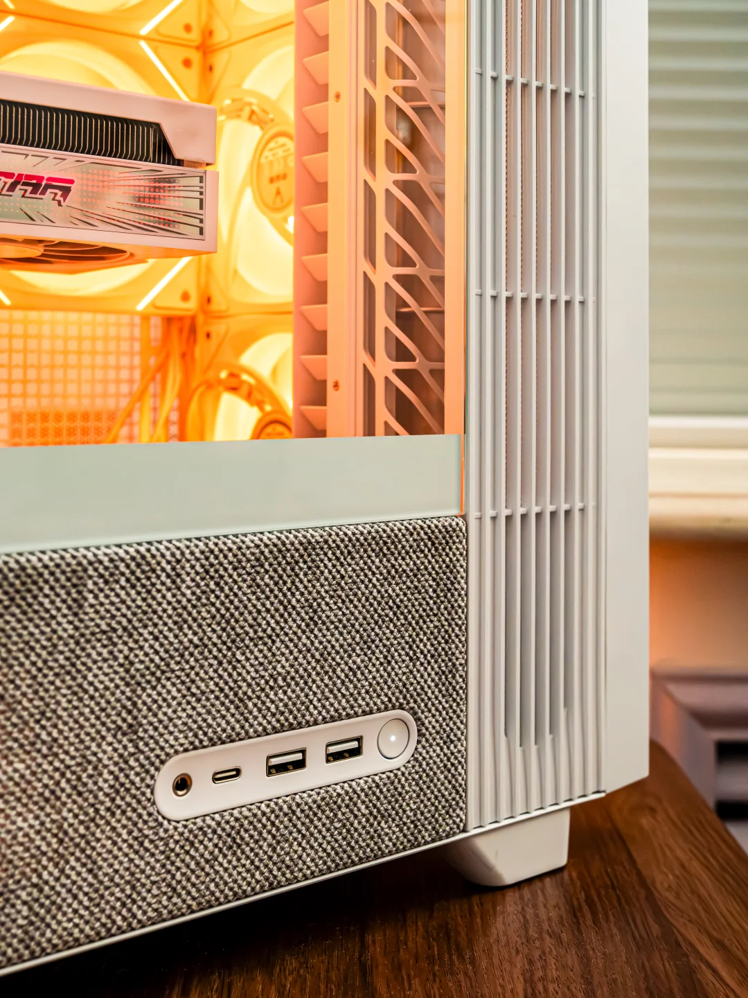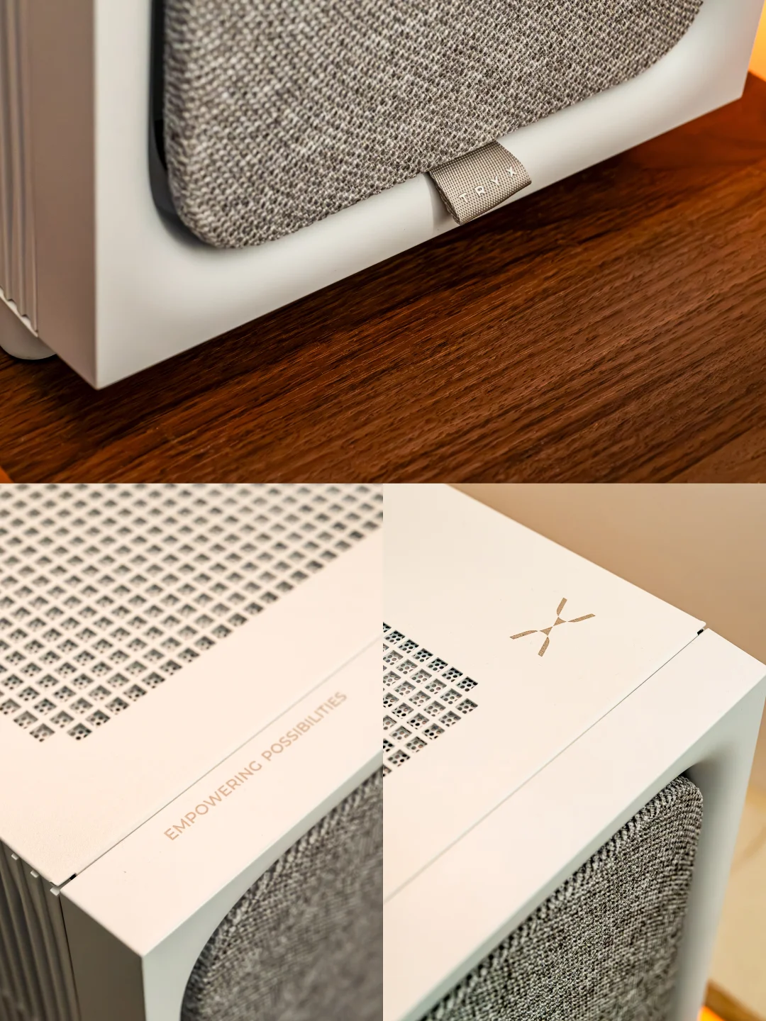 它打破了机箱的刻板印象,不再是冷冰冰的金属与塑料,而是音响级的布艺面料,摸上去是软软的亲肤触感,编织的纹理超有质感,放在桌面直接化身家居摆件,完美融入各种装修风格,主打一个“织予其表,静在其中”~