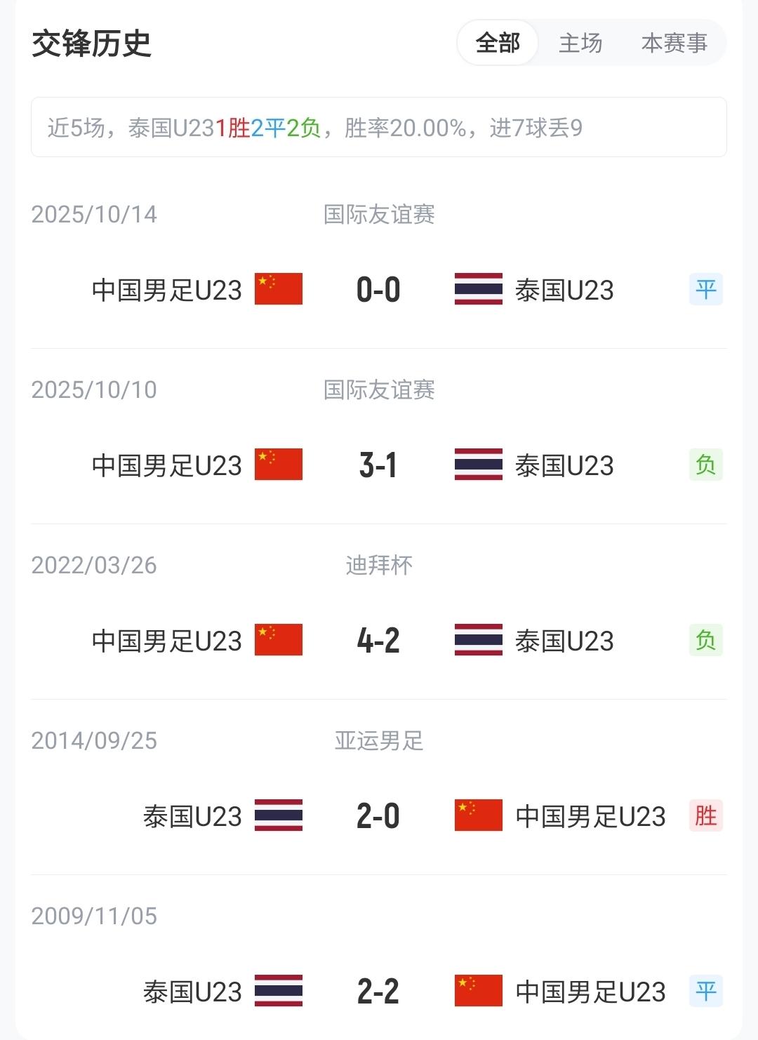 目前D组积分榜上,U23国足1胜1平积4分,位列榜首,本场比赛打平即可出线;泰国U23以1平1负积1分,位列第4。两队曾在去年10月有过两次交手,U23国足1胜1平保持不败。