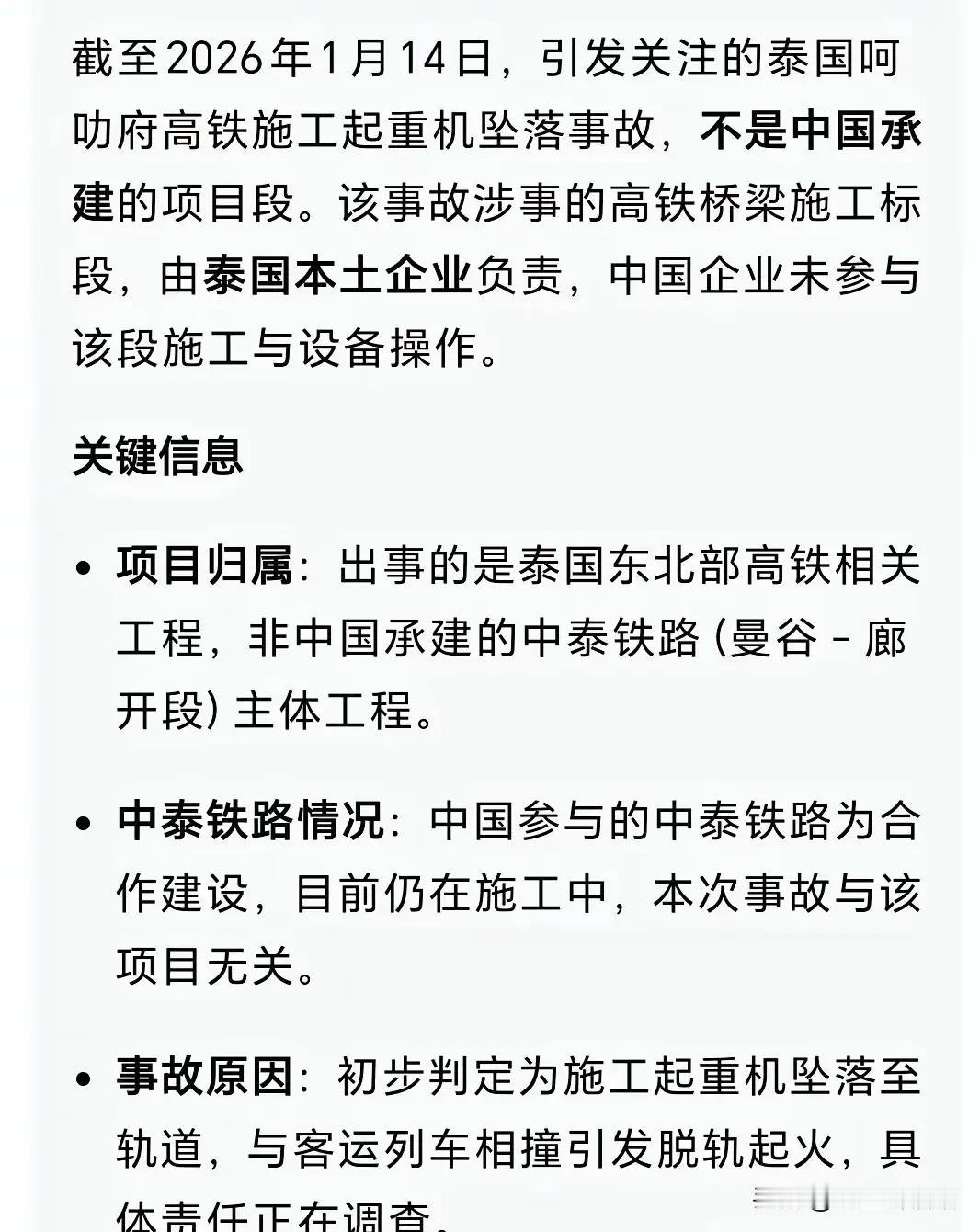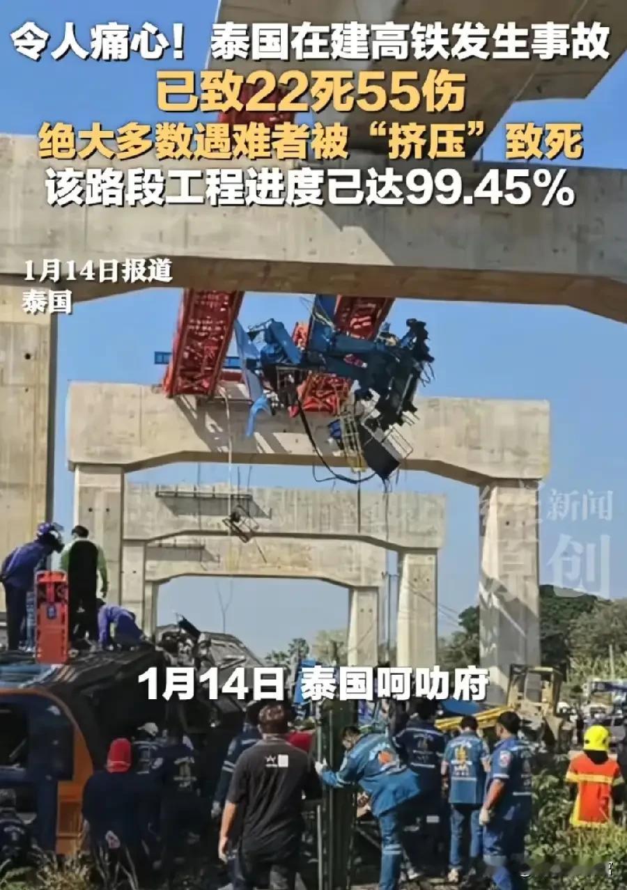 泰国在建铁路事故已致29死 泰国这在建铁路事故太惨烈了!1月14日上午,呵叻府一台起重机在高铁项目施工时坠落,砸中行驶火车,车厢起火还脱轨。最新通报显示,已造成29人死亡、67人受伤。这么多鲜活的生命消逝,还有不少人受伤,想想都痛心。泰国总理阿努廷收到报告后,指示副总理兼交通部长披帕前往现场。不过目前事故原因还在调查,希望能尽快查明,给遇难者和伤者家属一个交代,也给类似工程提个醒,安全这根弦得时刻绷紧啊。