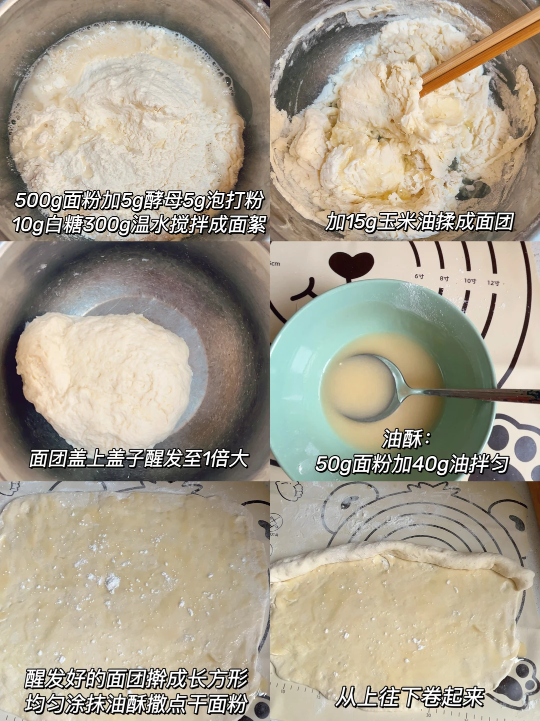 2⃣️发酵好的面团擀成长方形面片,均匀涂抹油酥(50g面粉加40g玉米油拌匀)从上往下卷起来