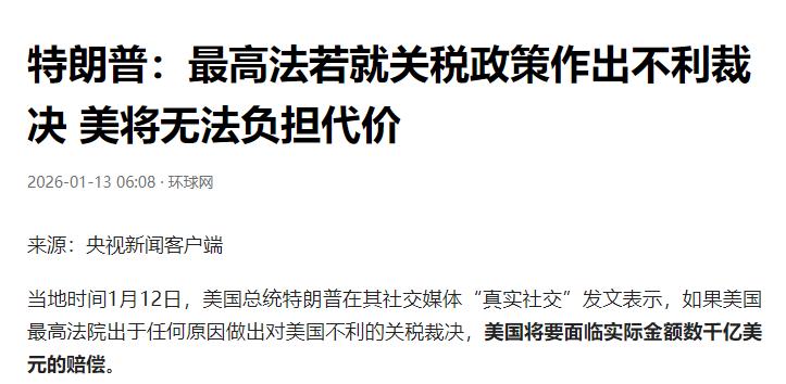 特朗普惊呼:完蛋了! 他为什么如此紧张? 只因为今天,也就是1月14日,美国最高法院将对他的关税政策公布判决结果。 按照特朗普的说法,一旦最高院做出不利的裁决,美国政府将面临数千亿美元的赔偿。 因为2025年特朗普上台后,绕开国会直接通过行政令推出了一系列加征关税措施,核心依据是1977年的《国际紧急经济权力法》,不仅面向全球征收10%的“最低基准关税”,还针对部分贸易伙伴设置了更高的对等关税。 在他看来,这是“美国优先”的重要抓手,能保护本土制造业、改善贸易逆差,但这套政策从一开始就埋下了法律隐患——美国宪法明确赋予国会贸易征税权,总统绕过国会大规模加征关税的行为,本身就涉嫌越权。 这也是最高法院审理的核心争议点,而从之前的听证情况来看,特朗普的处境并不乐观。2025年11月的庭审中,包括保守派和自由派在内的9位大法官,几乎都对“靠宣布国家紧急状态征收全面关税”的做法持怀疑态度,不少大法官直接质疑《国际紧急经济权力法》是否赋予了总统如此大的权限。 此前美国国际贸易法院和联邦巡回上诉法院都已判定这套关税政策违法,特朗普政府是一路上诉到最高法院的,这也让外界普遍预测不利裁决的概率更高,网络预测平台Polymarket的数据显示,关税措施被裁定合法的概率一度跌到20%。 特朗普口中的“数万亿美元灾难”,并非危言耸听,而是有实打实的利益纠葛。首先是直接的退税赔偿,根据美国海关与边境保护局的数据,截至2025年底,特朗普政府靠这些关税已经收取了超过1300亿美元的收入,若政策被裁定违法,这些钱都需要退还给企业。 而特朗普提到的数千亿美元赔偿,就来自于大量企业的诉讼索赔。目前已有超过3400家美国企业提起诉讼,其中不乏特斯拉、福特、奔驰这样的巨头,特斯拉在诉状中明确要求退还已支付的关税及利息,还抱怨关税增加了生产成本、影响了盈利能力,甚至导致其部分零部件采购计划推迟18个月。 除了车企,零售巨头开市客、家居建材商家得宝等也纷纷起诉,这些诉讼叠加起来,形成了数千亿美元的索赔规模。 更麻烦的是那些“为避关税而投资”的偿还问题。特朗普政府当初推关税时,曾鼓励企业在美国本土建厂以避开进口关税,不少企业响应号召投入巨资建设工厂、购置设备。 如果关税政策突然失效,这些投资就成了“无用功”,企业自然会要求政府补偿损失。比如有半导体企业为了规避零部件关税,斥资数十亿美元在美国新建生产线,如今面临政策反转的风险,这部分损失加起来,才让特朗普算出了“数万亿美元”的天文数字。 美国联邦政府的财政状况本就不乐观,2025财年赤字已经达到1.8万亿美元,占GDP的5.9%,若再加上巨额赔偿,无疑会让财政赤字雪上加霜,甚至可能推高国债收益率,进一步冲击美国经济。 这场判决的影响还不止于经济层面,更牵扯到美国的政治格局。今年11月美国将举行国会选举,众议院所有席位和参议院三分之一席位都要改选,特朗普所在的共和党能否保住国会优势,很大程度上取决于其政策的民意支持率。 而关税政策早已让美国民众怨声载道,美联储和多家研究机构都证实,关税推高了物价,让普通四口之家每年多支出2000多美元。在去年11月的地方选举中,共和党就因未能兑现“降物价”承诺而遭遇惨败,如今若关税政策被裁定违法,无疑会进一步打击特朗普的政治声誉。 即便特朗普政府想找替代方案,比如用《贸易法》301条款或《贸易扩张法》232条款继续征税,但其效果远不如当前政策,且同样可能面临法律挑战。 从全球贸易的角度看,这场判决也将产生连锁反应。如果最高法院裁定关税违法,美国现有关税水平最高可能降低20%,此前受关税影响的商品价格有望回落,国际贸易或许能迎来一波红利;若裁定合法,则会让全球贸易的不确定性进一步增加,供应链重塑的趋势会持续加剧。 目前全球企业都在密切关注判决结果,毕竟这不仅关乎美国的贸易政策走向,更会影响全球产业链的布局。 说到底,这场“关税危机”本质上是特朗普政府“单边贸易政策”的必然结果,靠行政令绕过国会推行重大经济政策,终究要面临法律的检验。 无论最高法院最终做出何种裁决,都将深刻影响美国的经济、政治和全球贸易格局。对于普通民众来说,这或许是一堂生动的“政策风险课”——任何脱离法律框架和市场规律的政策,终究难以长久。