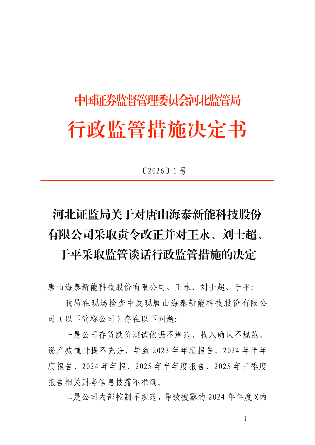 针对以上问题,河北证监局决定对唐山海泰新能科技股份有限公司采取责令改正的行政监管措施,对王永、刘士超、于平采取监管谈话的行政监管措施。