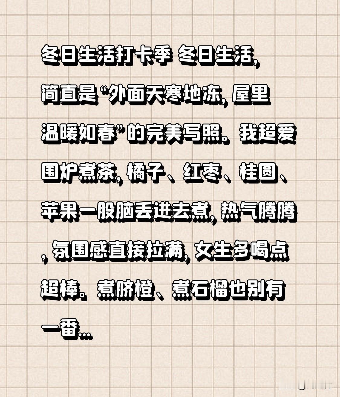 冬日生活打卡季 冬日生活,简直是“外面天寒地冻,屋里温暖如春”的完美写照。我超爱围炉煮茶,橘子、红枣、桂圆、苹果一股脑丢进去煮,热气腾腾,氛围感直接拉满,女生多喝点超棒。煮脐橙、煮石榴也别有一番风味。 要是觉得不过瘾,来个火锅局。叫上亲朋好友,或者自己一个人,买点肥牛卷、丸子,煮个麻辣锅底,幸福感瞬间爆棚。跨年时,虽然说“不出,吃2样,3不留,开年鸿运当头”有点迷信,但讨个好彩头也不错。冬日就是要这样,把温暖和幸福吃进肚子里!