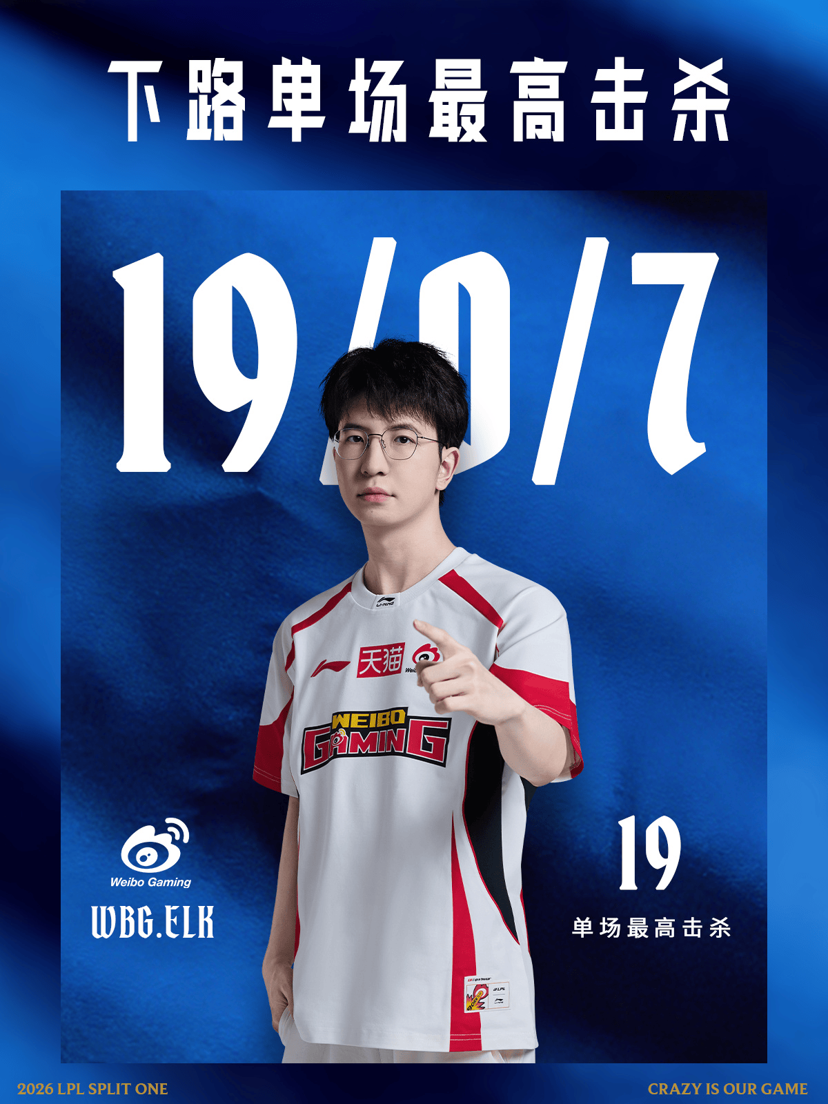 在今日WBG对战IG第二局的比赛中,Elk选手使用卡莎斩获19杀,追平了由GALA、Kane、weixiao、kRYST4L、Uzi、Viper、Starry七位选手共同保持的下路单场最高击杀纪录。