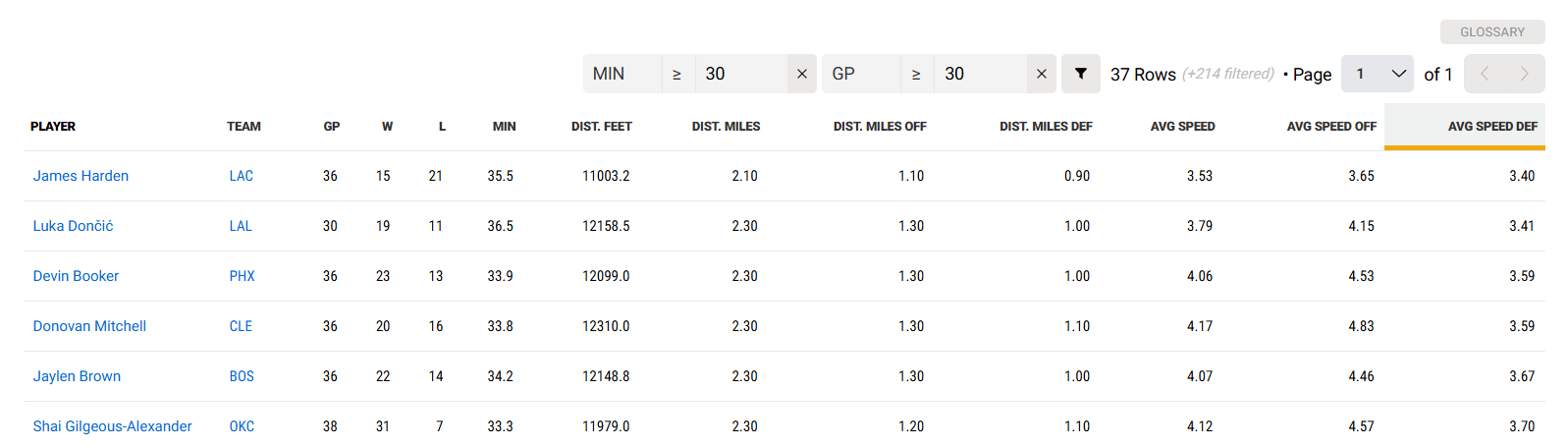 据NBA官网球员跑动能力的统计,出场超过30场,场均30分钟以上的后卫里,哈登在防守端的平均速度联盟倒数第一,东契奇是倒数第二。