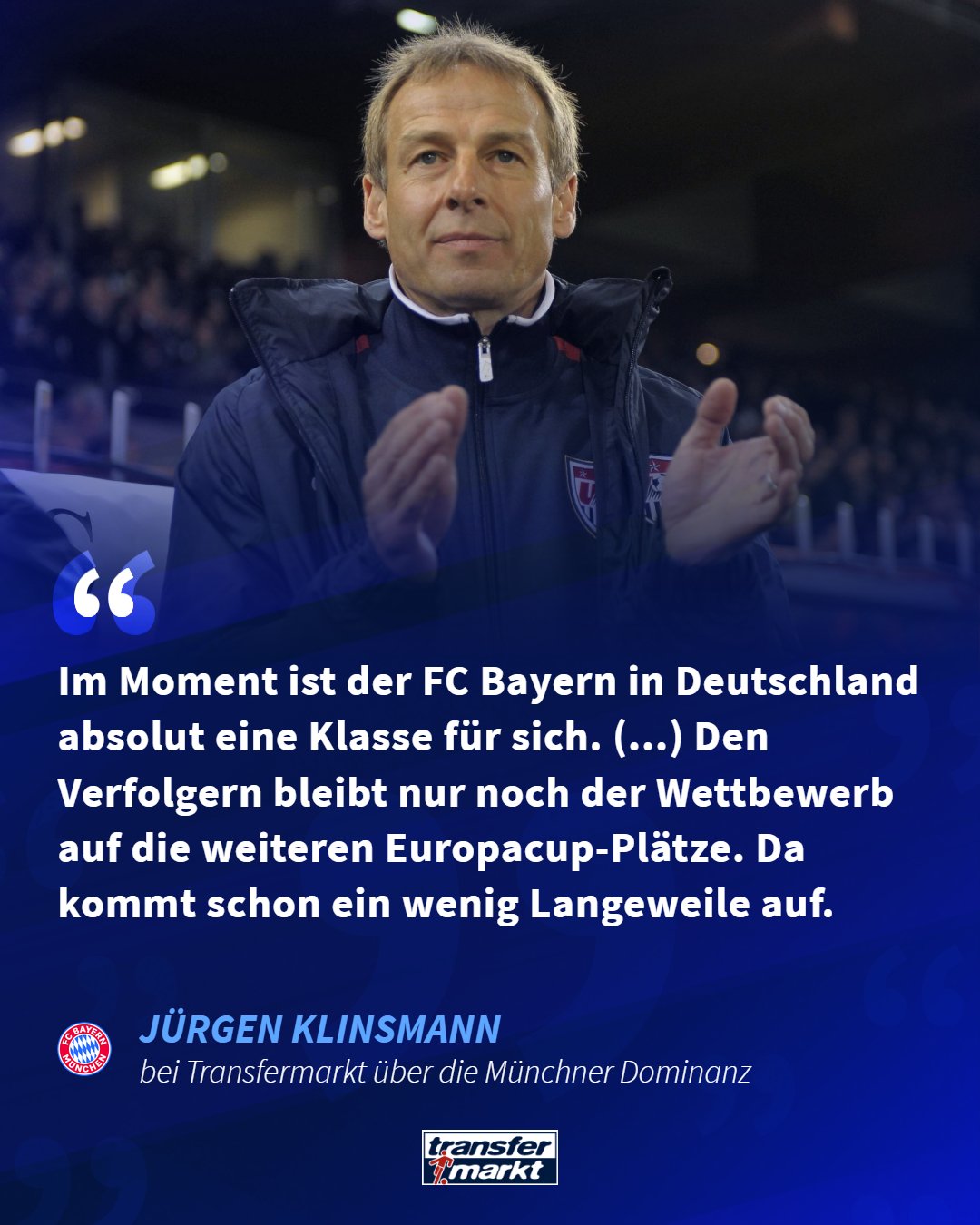 虎扑01月14日讯近日,德国转会市场网站刊发了对前德国国家队主帅尤尔根-克林斯曼的专访。这位足球专家在访谈中直言不讳地表示,拜仁慕尼黑在本赛季德甲联赛中的优势已不可动摇,冠军悬念几乎提前终结。除此之外,他还谈到了拜仁欧冠的争冠前景、球队主帅孔帕尼以及球队核心诺伊尔和新星卡尔。