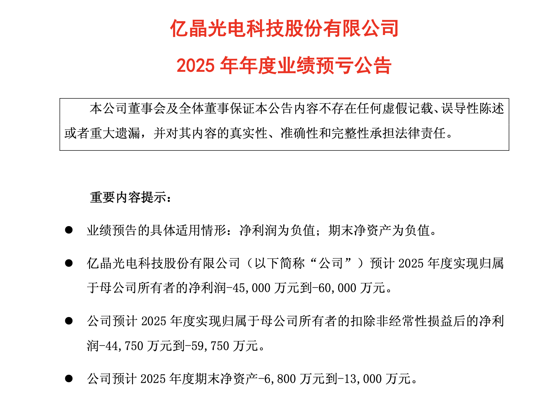 1月13日晚,亿晶光电发布业绩预告,预计2025年净亏损4.5亿-6亿元,预计2025年度期末净资产-0.68亿元至-1.3亿元。