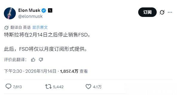 今天马斯克在X上宣布,特斯拉将在2月14日之后停止销售买断制FSD,仅以月度订阅形式提供。