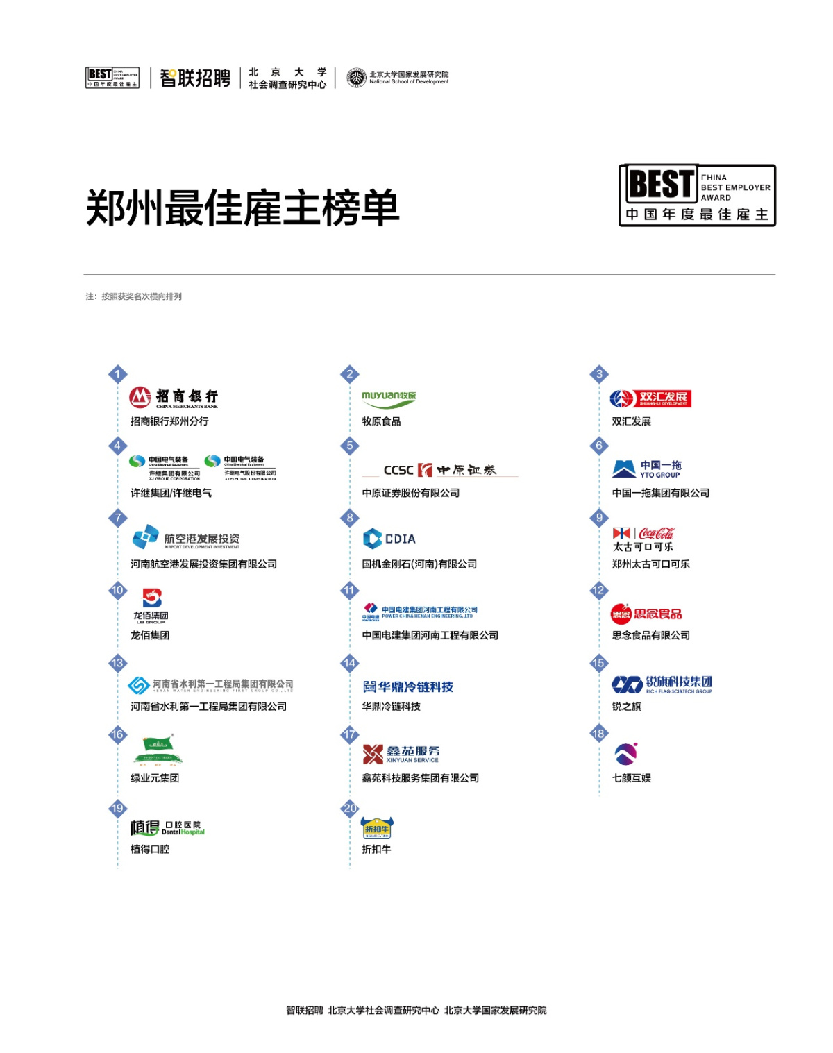2026新年伊始,由智联招聘发起的“人机共生·智启未来”2025年度最佳雇主20强榜单揭晓,招商银行郑州分行、牧原食品、双汇发展、许继集团/许继电气、中原证券股份有限公司、中国一拖集团有限公司、河南航空港发展投资集团有限公司、国机金刚石(河南)有限公司、郑州太古可口可乐、龙佰集团、中国电建集团河南工程有限公司、思念食品有限公司、河南省水利第一工程局集团有限公司、华鼎冷链科技、锐之旗、绿业元集团、鑫苑科技服务集团有限公司、七颜互娱、植得口腔、折扣牛成为郑州地区最佳雇主。