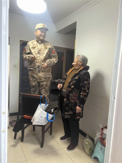 近日合肥市双岗街道一里井社区开展“民兵服务日”活动,活动聚焦独居老人、困难群众等特殊群体的实际需求,持续提供家电维修、生活照料、健康咨询等便民服务,让基干民兵的“橄榄绿”成为基层治理中最温暖的底色。图为一基干民兵为独居老人马奶奶家安装LED灯泡。