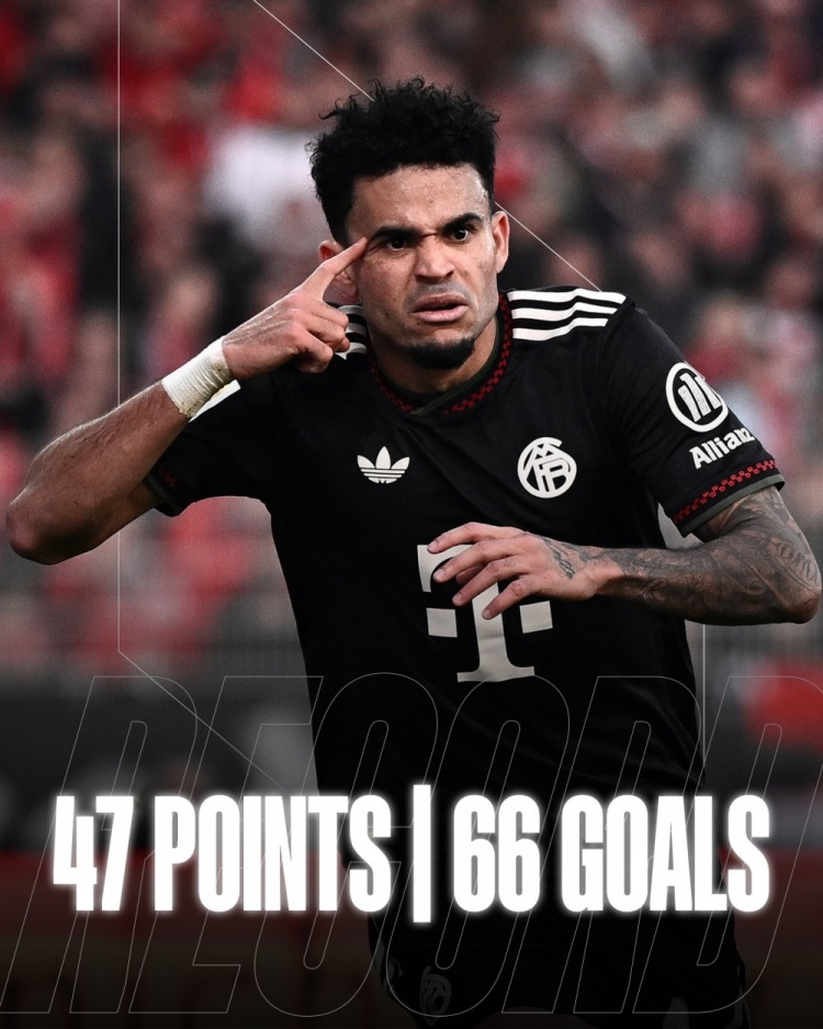 拜仁本赛季德甲上半程17轮比赛积47分,打进66球,创造德甲上半程最佳战绩,拜仁官方社媒晒海报庆祝。