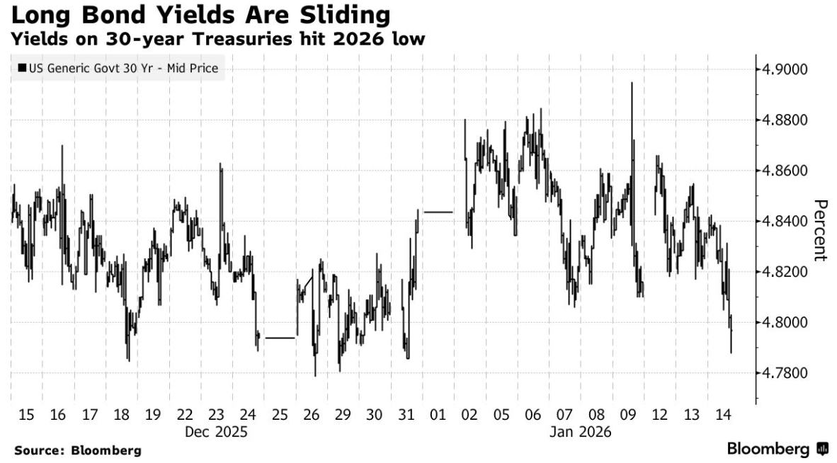 截至周三收盘,各期限美债收益率普遍下跌,跌幅在2至5个基点之间。30年期国债收益率今年首次跌破4.80%,并低于其200日均线水平——自去年12月初以来,该收益率尚未在收盘时低于此均线。