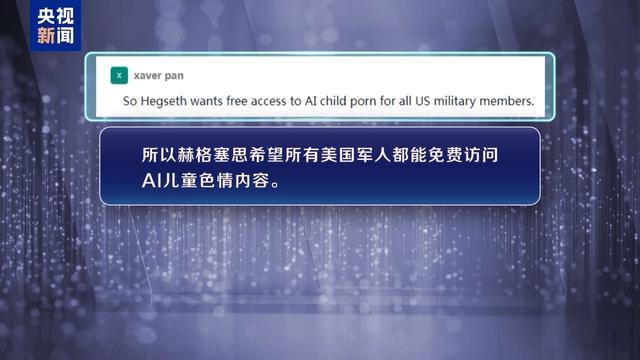 有网友将“格罗克”涉色情内容遭调查联系起来讽刺说,“所以赫格塞思希望所有美国军人都能免费访问AI儿童色情内容。”