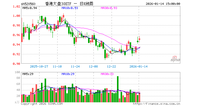 1月14日,香港大盘30ETF(520560)涨0.74%,成交额2940.32万元。当日份额减少400.00万份,最新份额为8.76亿份,近20个交易日份额增加6200.00万份。最新资产净值计算值为8.43亿元。