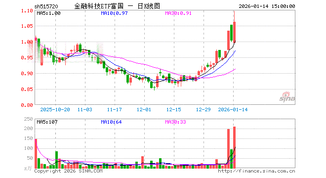1月14日,金融科技ETF富国(515720)涨5.88%,成交额2.24亿元。当日份额减少6200.00万份,最新份额为4.01亿份,近20个交易日份额减少3.10亿份。最新资产净值计算值为4.23亿元。