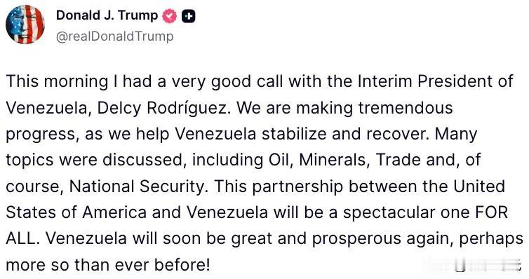 特朗普:今天上午,我与委内瑞拉临时总统罗德里格斯进行了一次非常愉快的通话。在帮助委内瑞拉稳定和恢复的过程中,我们取得了巨大的进步。会上讨论了许多议题,包括石油、矿产、贸易,当然还有国家安全。美国和委内瑞拉之间的这种伙伴关系对所有人来说都将是一个壮观的伙伴关系。委内瑞拉很快就会再次变得伟大和繁荣也许比以往任何时候都要繁荣!南美委内瑞拉 特朗普政府创造了世界战争史上的奇迹!美军用特种兵、高科技手段完成了委内瑞拉政权的更替!