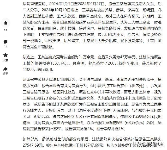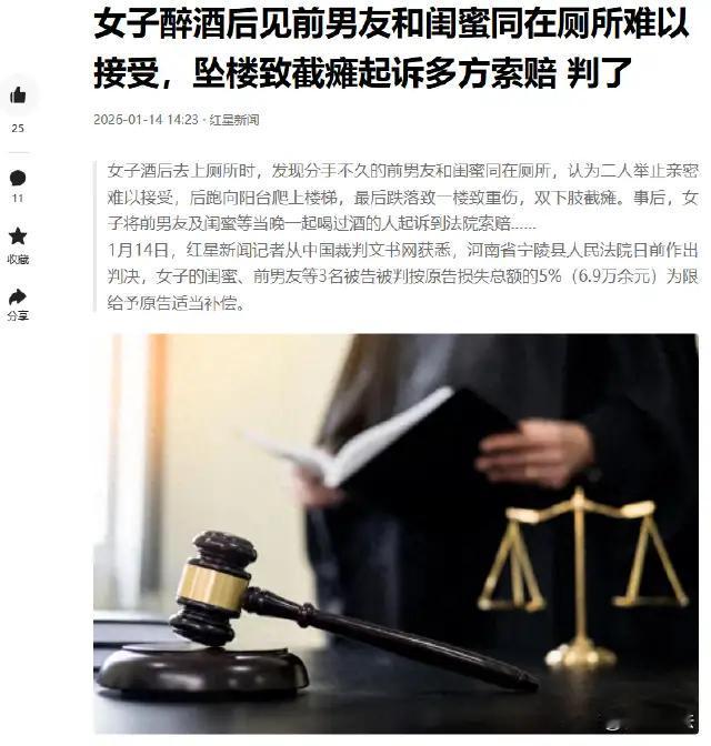 法治警示:酒局之后的安全边界与情绪管控,莫让冲动酿终身遗憾 朋友相聚饮酒本是联络情感的社交场景,但酒精催化下的情绪失控与安全责任疏忽,可能引发无法挽回的悲剧。近日,河南省宁陵县审理的一起民事纠纷案件,为公众敲响了关于酒局安全义务、情绪管理与法律责任的三重警钟。 案件详情显示,王女士与薛先生曾为恋人关系,分手后一个月,二人与王女士的闺蜜郭女士及共同朋友李先生相约聚餐饮酒。因心情不佳,王女士饮酒过量陷入醉酒状态,餐后被三人一同送回其出租屋。次日凌晨,王女士醉酒后醒来如厕时,看到薛先生与郭女士在卫生间内共处,认为二人存在亲密互动,情绪瞬间崩溃。随后,王女士跑向阳台并攀爬至楼顶,薛先生察觉危险后迅速追赶,虽奋力拉住王女士双手施救,但因体力不支未能阻止其坠楼。事故造成王女士双手大部分肌瘫、双下肢截瘫,经鉴定需完全护理依赖,相关损失合计达138万余元。事后,王女士将薛先生、郭女士及李先生诉至法院,索赔43万余元。 法院审理后作出关键认定:三名被告与王女士虽有共同饮酒行为,但已将醉酒的王女士安全送至家中,且王女士归家后未再饮酒便回房休息,应认定三被告已履行合理范围内的安全护送与照顾义务,前期共同饮酒行为未直接导致王女士陷入危险状态 。王女士作为完全民事行为能力人,其坠楼后果系自身酒后情绪失控实施危险行为所致,与三被告的行为无直接因果关系,故不支持基于共同饮酒主张的侵权赔偿请求 。但依据公平原则及公序良俗,结合双方朋友关系与共同饮酒的事实,法院酌定三被告给予适当补偿,按损失总额的5%(6.9万余元)划分责任:郭女士、薛先生各补偿2%,李先生补偿1%,扣除已垫付费用后,三被告分别需支付相应补偿款 。 此案的判决清晰界定了共同饮酒的责任边界:根据《民法典》相关规定及司法实践,共同饮酒人负有提醒、劝阻、看护、安全护送的合理注意义务,但该义务并非无限延伸,若已尽到必要保障责任,无需对饮酒者自身故意或冲动导致的损害承担侵权责任 。同时,案件更凸显了情绪管控的重要性——成年人在面对情感纠葛时,应保持理性克制,切勿因一时冲动采取危险行为,否则需自行承担由此造成的严重后果。 该事件警示所有公众:酒局聚会中,组织者与参与者需坚守安全底线,主动劝阻过量饮酒,妥善安置醉酒者,留存相关安全保障证据;个人在饮酒后更应恪守理性,学会疏导负面情绪,避免因意气用事酿成终身遗憾。情理与法治的平衡之下,唯有坚守安全责任、管控自身行为,才能让社交场景真正传递温暖,远离风险与伤痛。 素材取于网络,侵权删除。