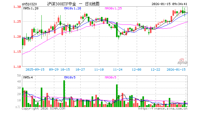1月15日,沪深300ETF中金(510320)开盘涨0.00%,报1.280元。沪深300ETF中金(510320)重仓股方面,宁德时代开盘跌0.35%,贵州茅台跌0.14%,中国平安跌0.15%,招商银行涨0.10%,紫金矿业跌0.62%,新易盛跌0.99%,中际旭创跌1.65%,美的集团涨0.40%,东方财富跌2.06%,长江电力涨0.63%。