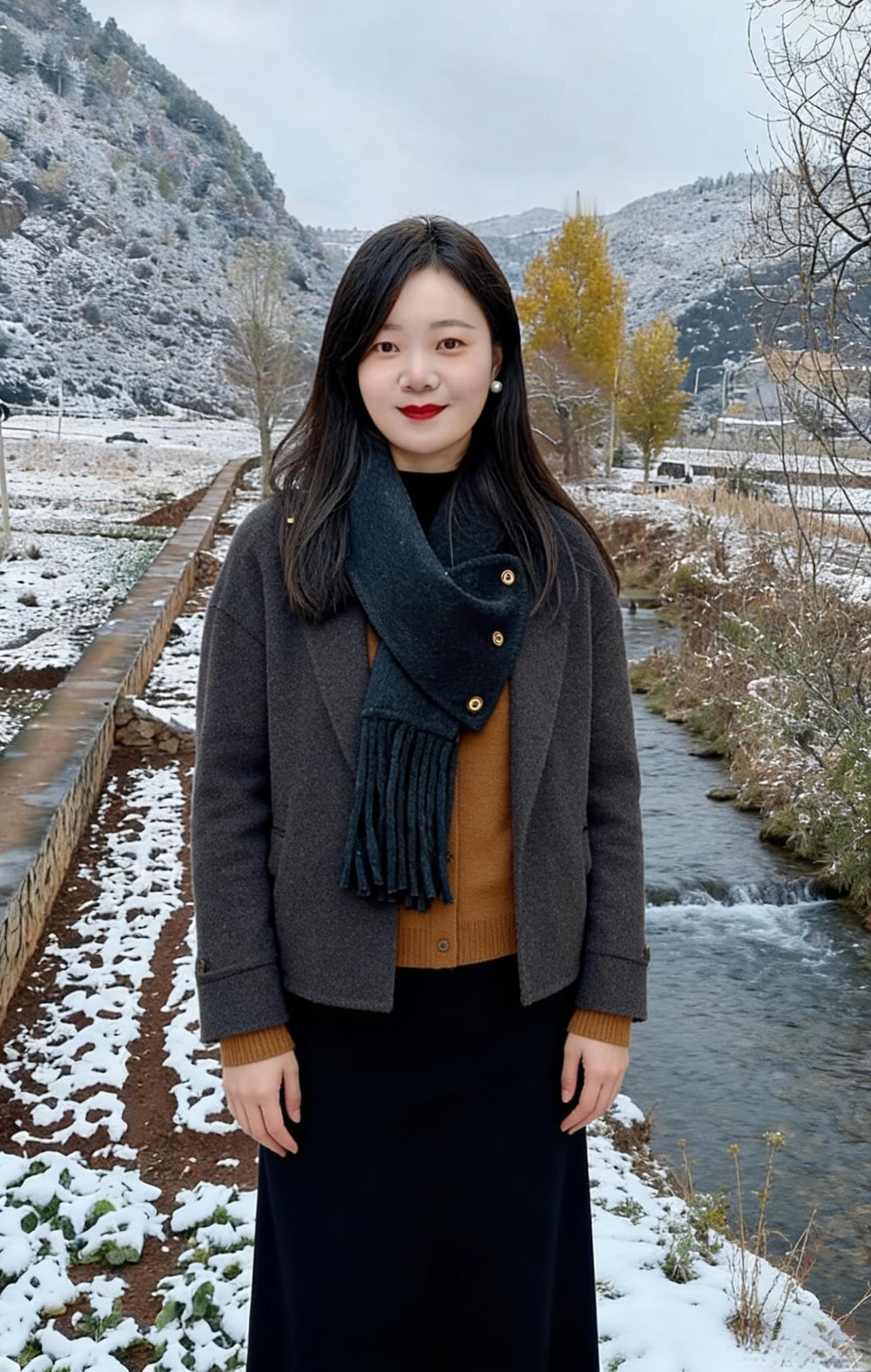 雪覆千山径欲迷,褐裘灰袂步萋萋。 溪声绕石冰纹碎,树影横空玉屑齐。 红果燃枝凝晓露,黑巾垂穗拂春泥。 行来不觉风霜冷,一笑眉间云自低。