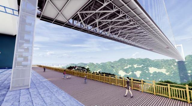 南津关长江大桥北岸桥头观景平台效果图,可通过电梯与人行步梯上下主桥慢行系统