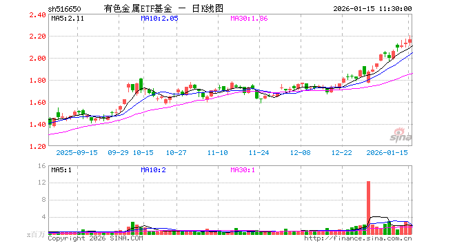 1月15日,截止午间收盘,有色金属ETF基金(516650)涨1.59%,报2.166元,成交额4.68亿元。有色金属ETF基金(516650)重仓股方面,紫金矿业截止午盘涨0.52%,北方稀土涨1.30%,洛阳钼业涨3.43%,华友钴业涨7.41%,山东黄金涨2.91%,赣锋锂业涨5.01%,中国铝业涨1.39%,中金黄金涨1.22%,赤峰黄金涨2.78%,天齐锂业涨2.83%。