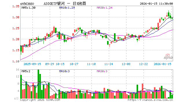 1月15日,截止午间收盘,A500ETF银河(563660)跌0.31%,报1.291元,成交额237.37万元。A500ETF银河(563660)重仓股方面,宁德时代截止午盘涨0.01%,贵州茅台跌0.47%,中国平安涨0.36%,招商银行涨0.37%,紫金矿业涨0.52%,新易盛跌1.51%,中际旭创跌1.07%,美的集团涨0.71%,东方财富跌2.87%,长江电力涨0.30%。