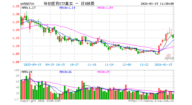 1月15日,截止午间收盘,科创医药ETF嘉实(588700)跌1.71%,报1.151元,成交额2048.27万元。科创医药ETF嘉实(588700)重仓股方面,联影医疗截止午盘跌3.43%,百济神州跌0.47%,百利天恒跌3.58%,惠泰医疗跌1.10%,艾力斯跌1.53%,君实生物跌1.82%,泽璟制药跌0.88%,荣昌生物涨3.80%,博瑞医药跌3.17%,华大智造跌4.70%。