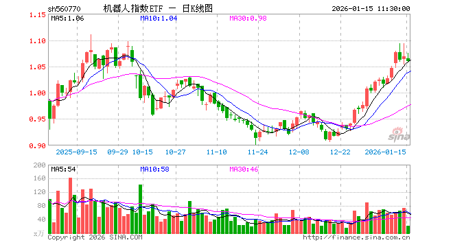 1月15日,截止午间收盘,机器人指数ETF(560770)跌0.84%,报1.060元,成交额2224.89万元。机器人指数ETF(560770)重仓股方面,汇川技术截止午盘涨2.53%,科大讯飞涨1.52%,石头科技跌1.77%,大华股份跌0.78%,中控技术跌1.77%,大族激光涨0.16%,机器人跌3.17%,双环传动涨0.31%,科沃斯跌1.98%,云天励飞跌0.66%。