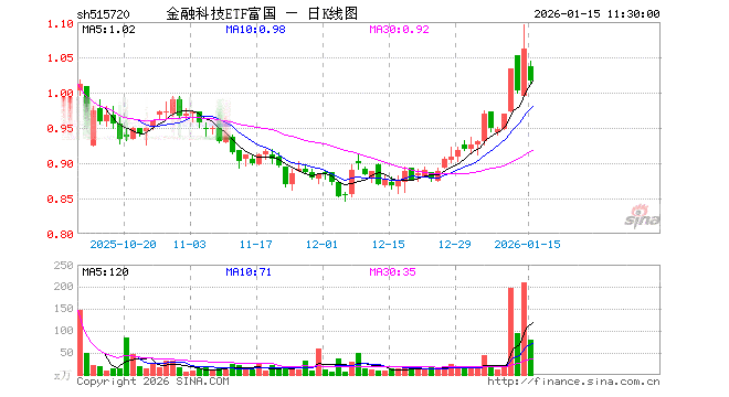 1月15日,截止午间收盘,金融科技ETF富国(515720)跌4.33%,报1.016元,成交额8115.54万元。金融科技ETF富国(515720)重仓股方面,同花顺截止午盘跌2.69%,东方财富跌2.87%,指南针跌4.79%,恒生电子跌2.65%,润和软件跌2.07%,东华软件跌4.13%,银之杰跌5.39%,新大陆涨0.07%,广电运通跌2.61%,四方精创跌5.18%。