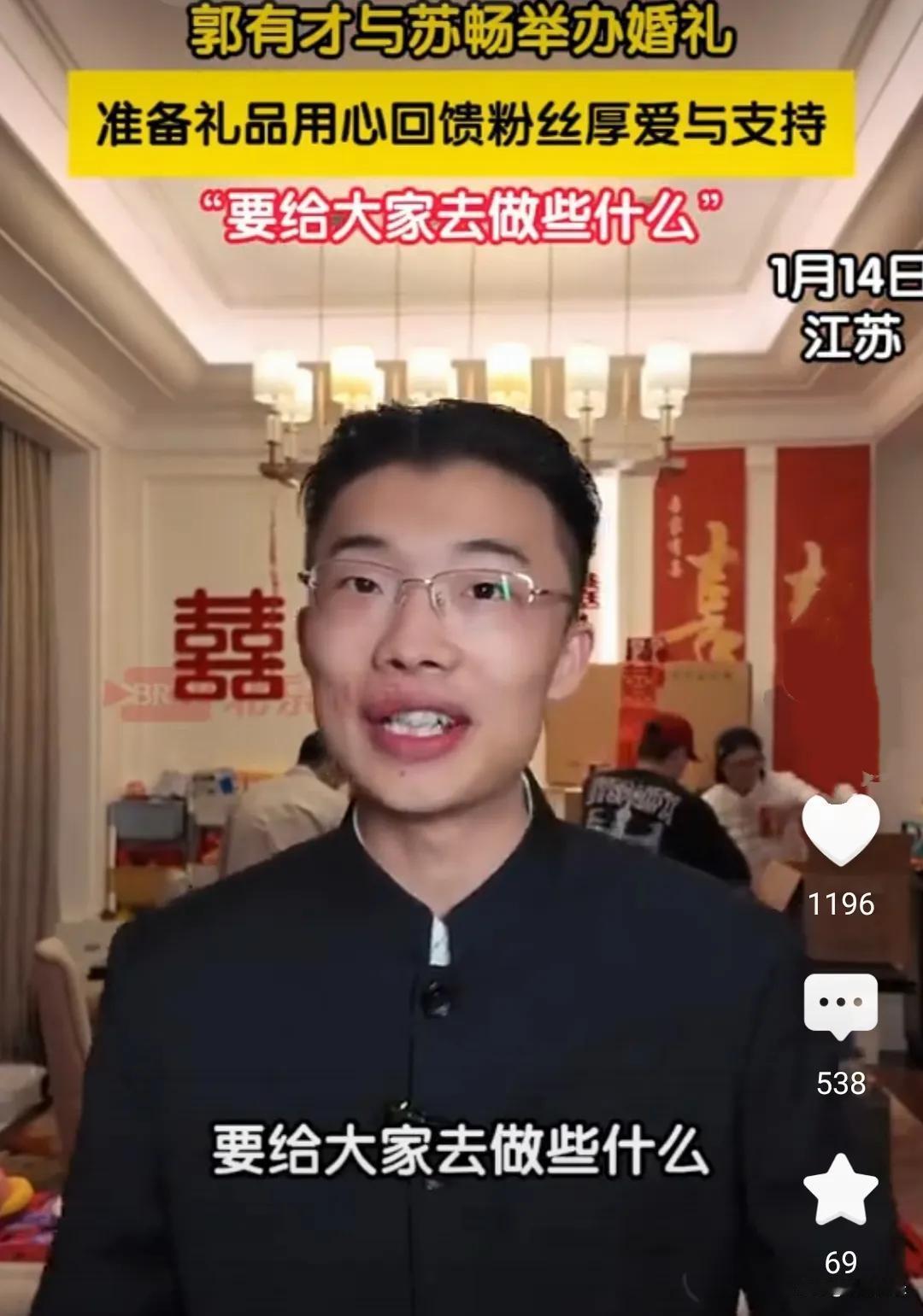 2026年1月15日,千万粉丝网红郭有才与相恋七年的女友苏畅在山东菏泽老家举办“约婚仪式”,次日将举行正式婚礼。这场从夜市烧烤摊逆袭而来的爱情长跑,因两人“共苦同甘”的经历备受关注。求婚时,郭有才以房产证和钥匙兑现“贤妻扶我凌云志,我还贤妻万两金”的承诺;苏畅母亲“零彩礼”支持小两口创业,被赞开明婚俗典范。婚礼拒绝商业套路,仅邀亲友与粉丝线上祝福,郭有才弹唱《诺言》时,苏畅泪洒现场。从一无所有到全网见证,这场婚礼成为草根逆袭最温暖的注脚。郭有才背影 郭有才走红毯 郭有才跳舞 郭有才奇迹 菏泽曹县郭有才 郭有才唱诺言 郭有才夫妻表演 能否发表一句今生感悟