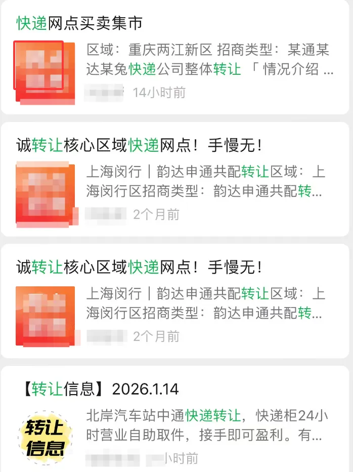 而不仅在小红书、闲鱼等平台,就连微信上,也出现大量快递驿站转让的文章。