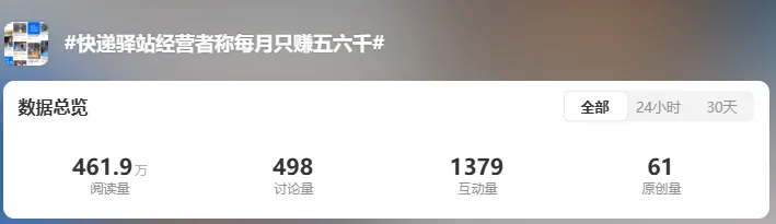还有今天的一个热搜话题——快递驿站经营者称每天干十几个小时,每月只赚五六千,还不如去当保安……