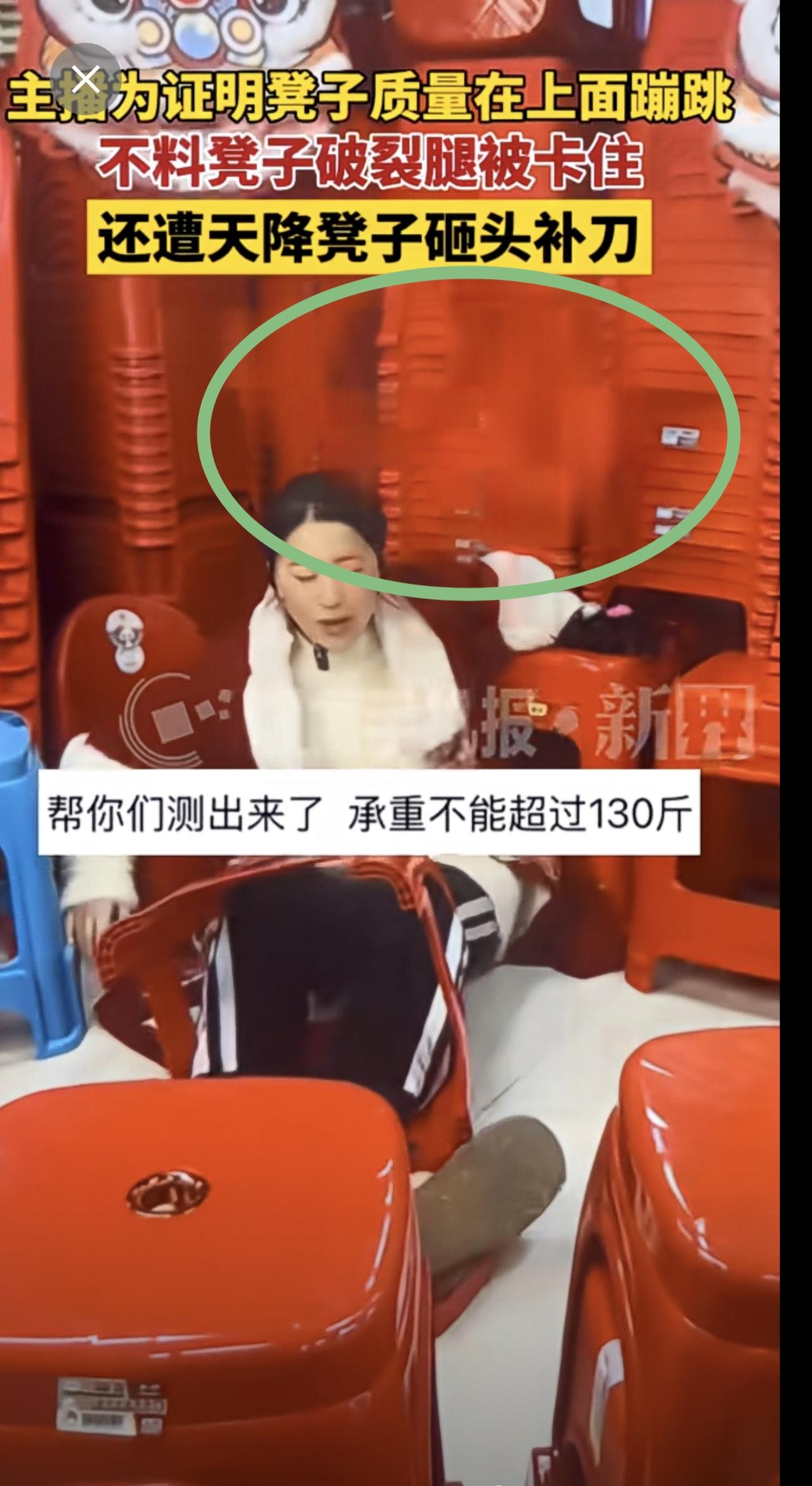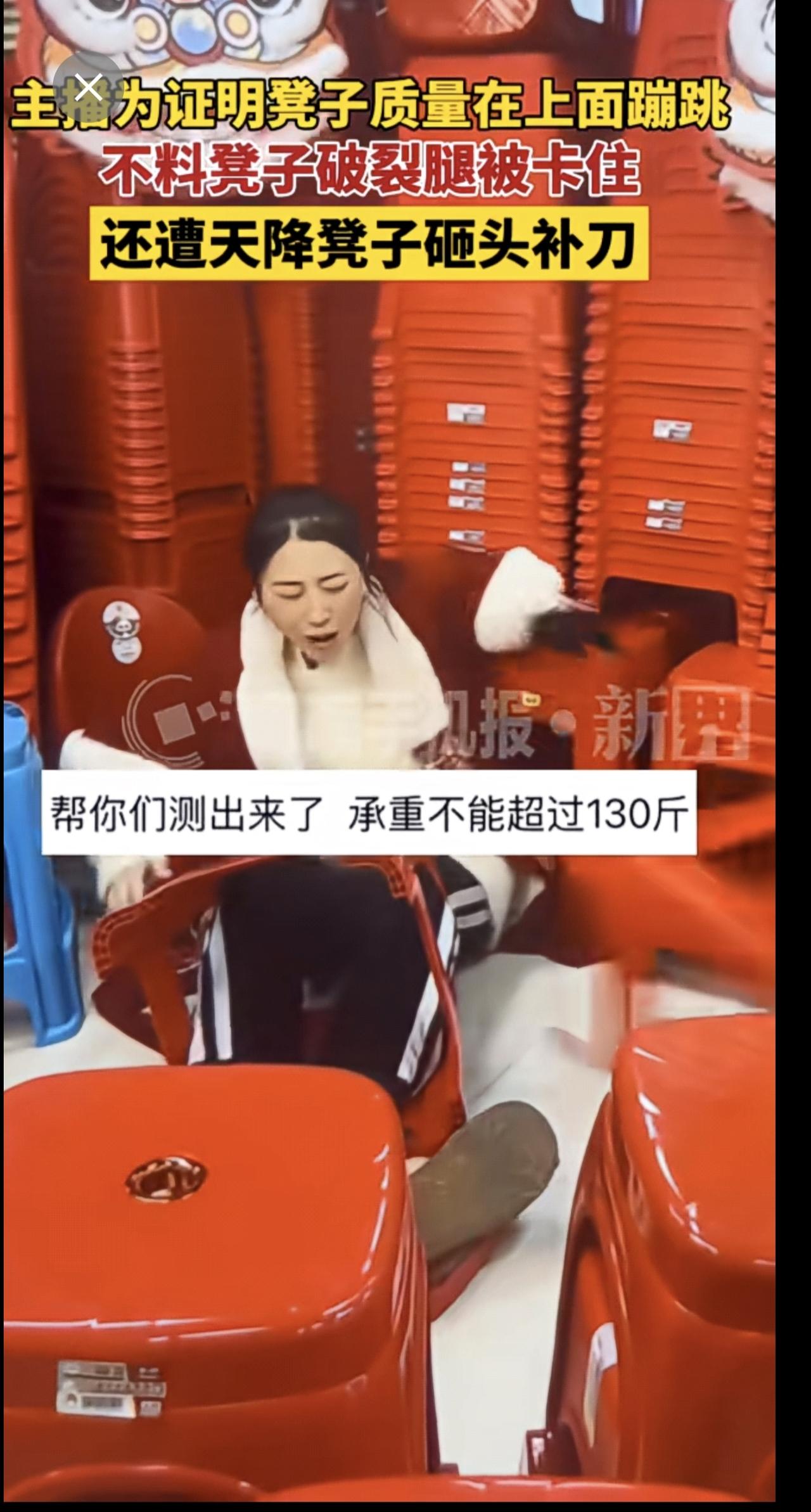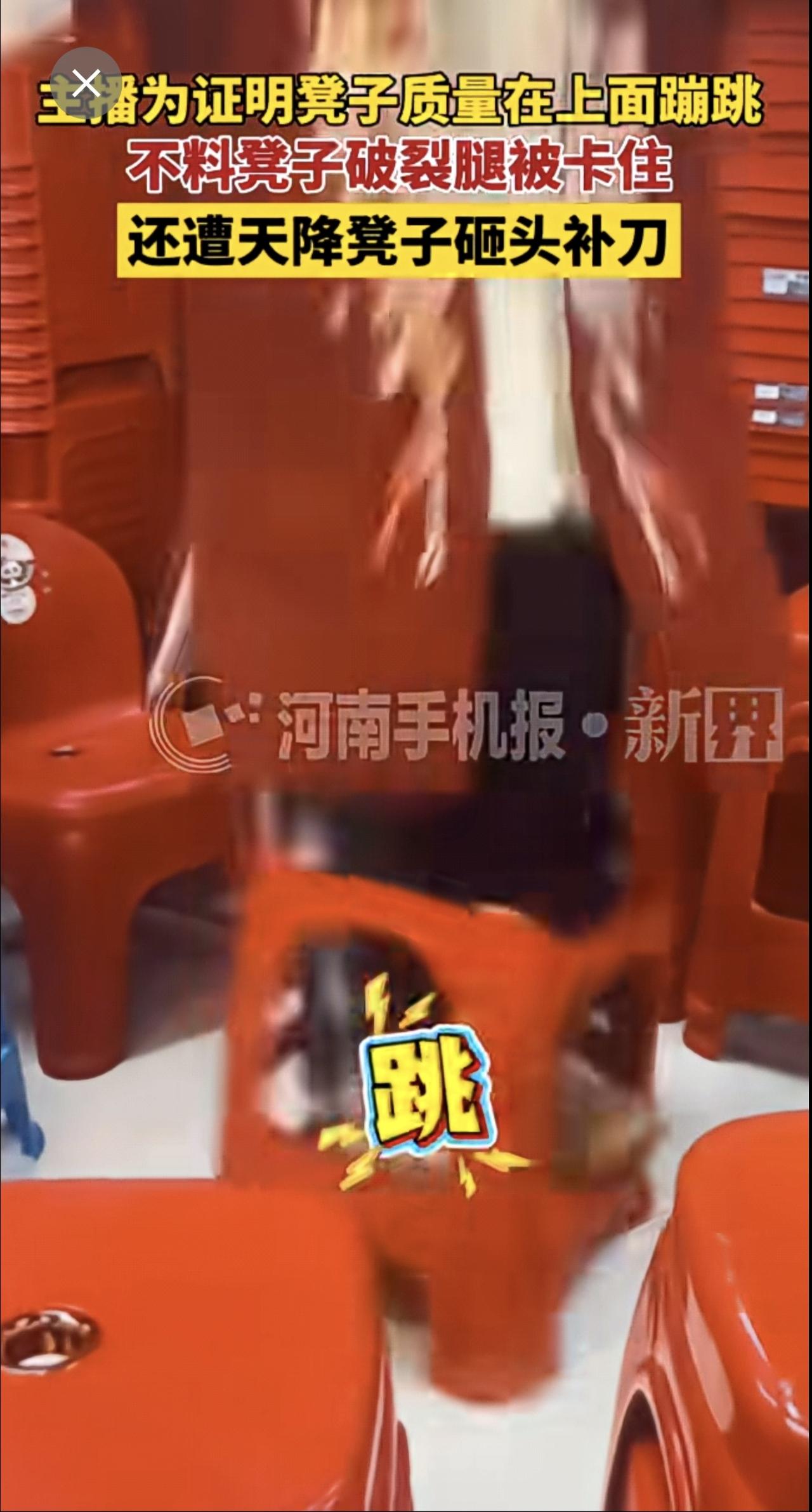 主播为证明凳子质量在上面蹦跳,不料凳子破裂腿被卡住,还遭天降凳子砸头补刀。万万没