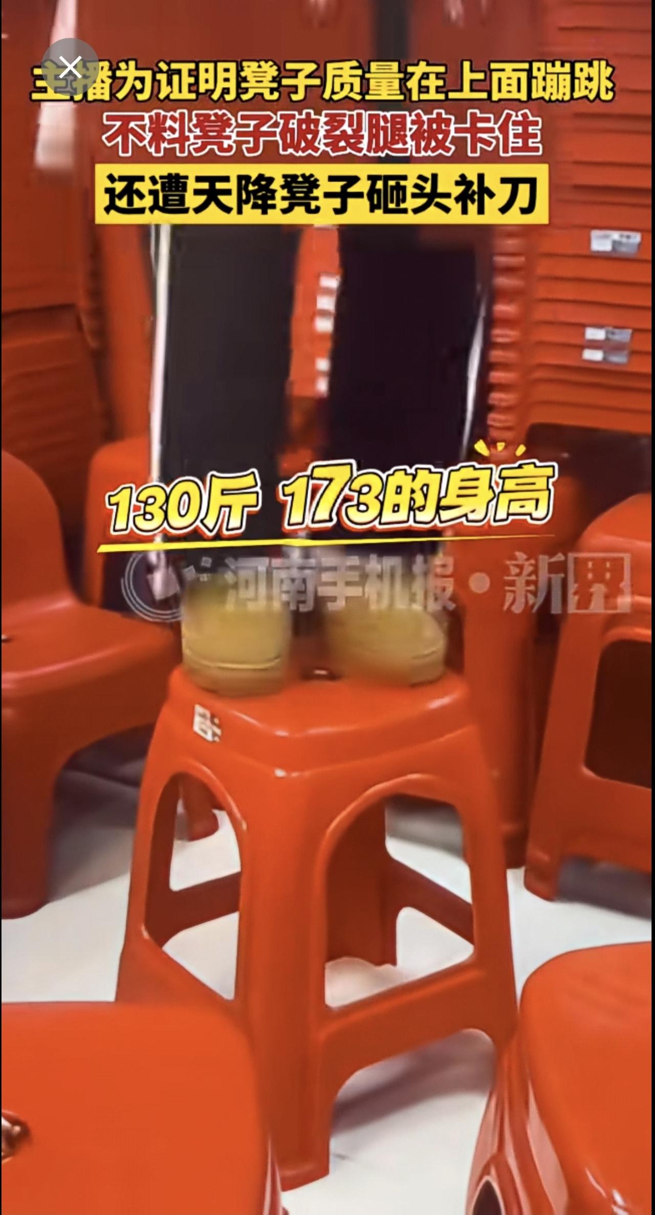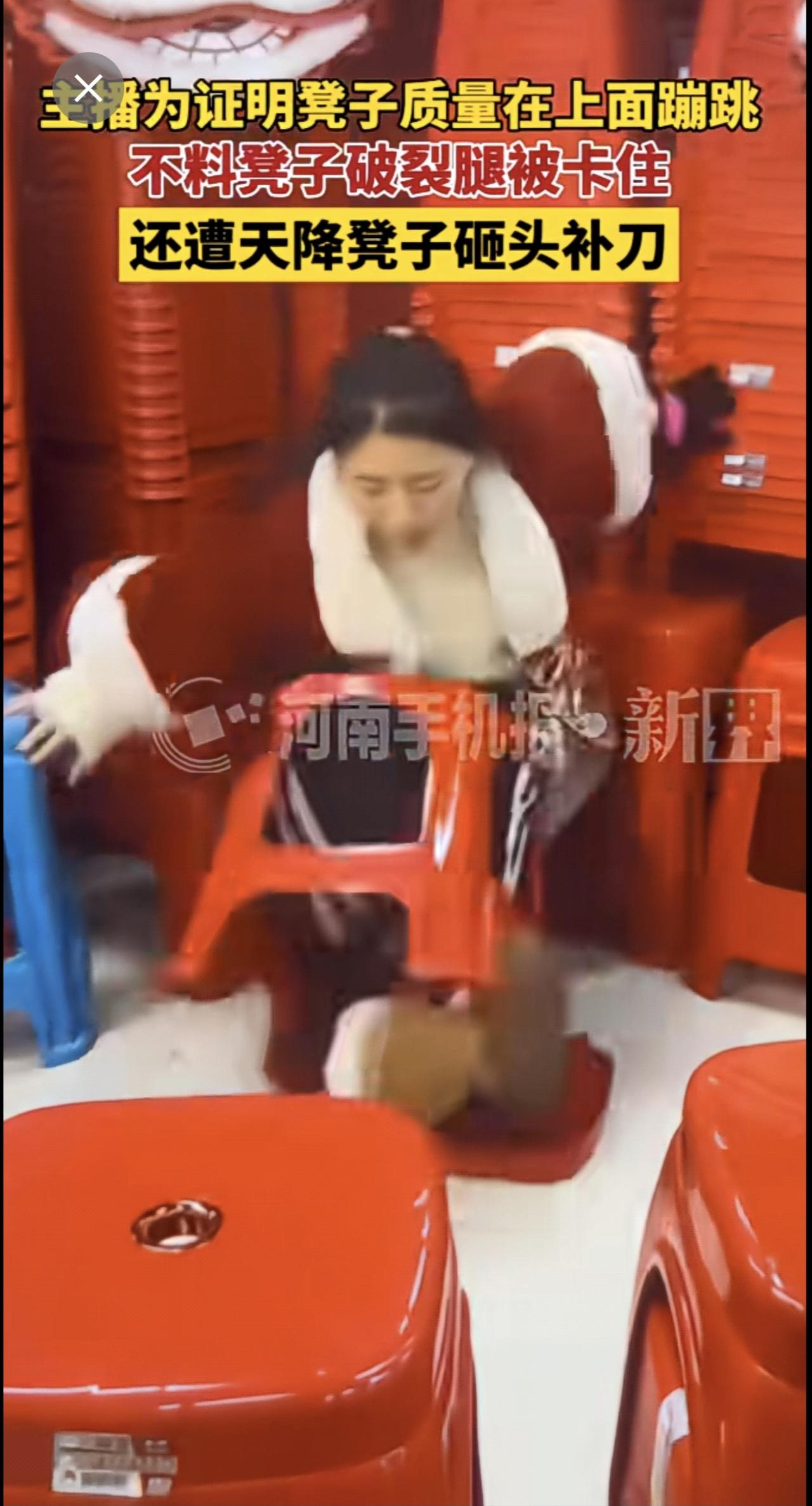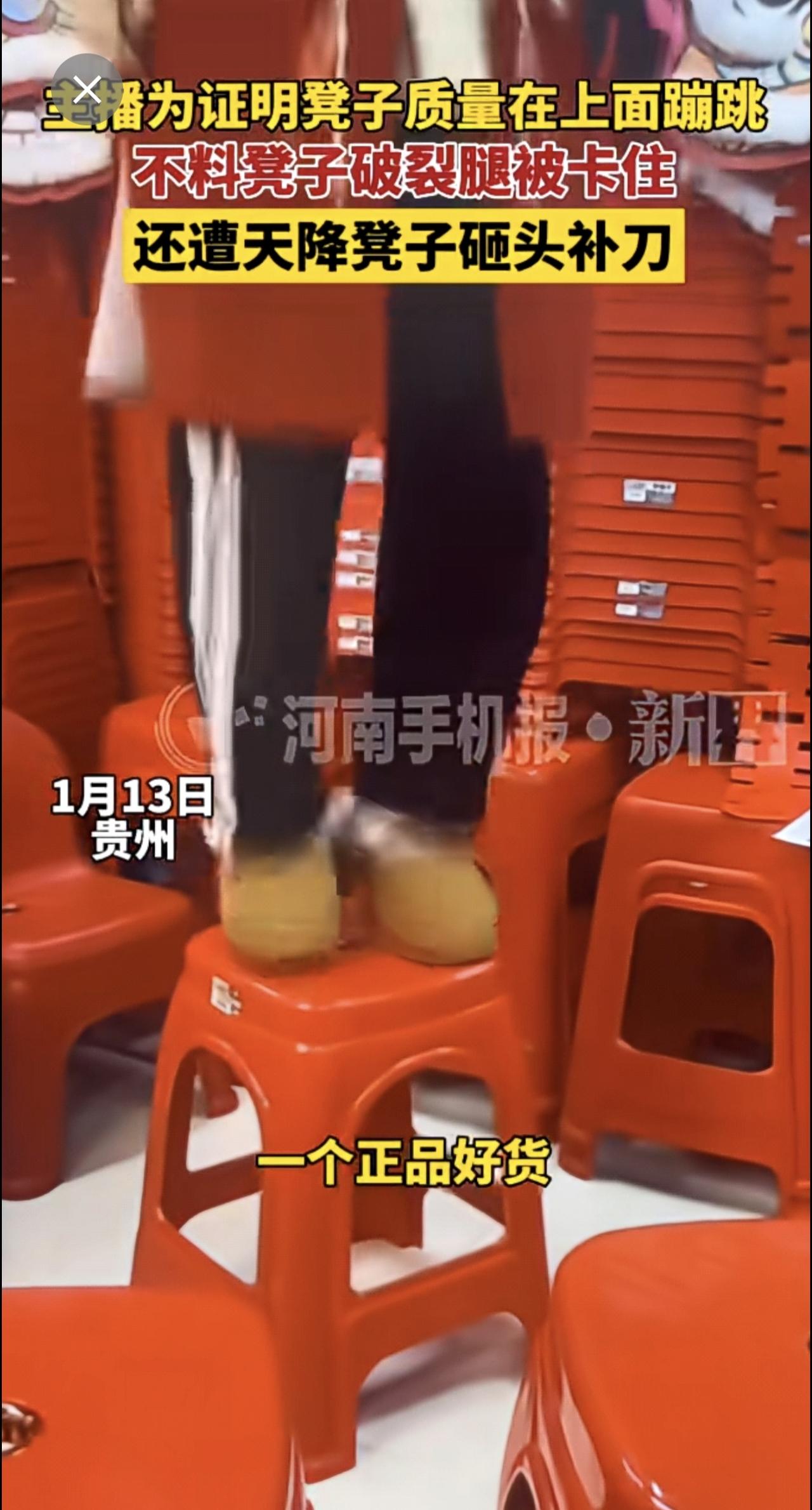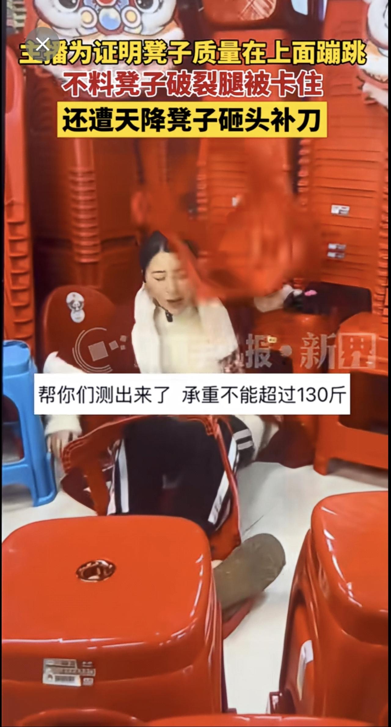 主播为证明凳子质量在上面蹦跳,不料凳子破裂腿被卡住,还遭天降凳子砸头补刀。万万没
