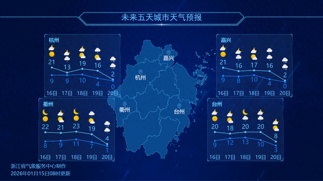 1月19日:全省多云,其中浙中北地区傍晚到夜里转阴天部分有小雨。