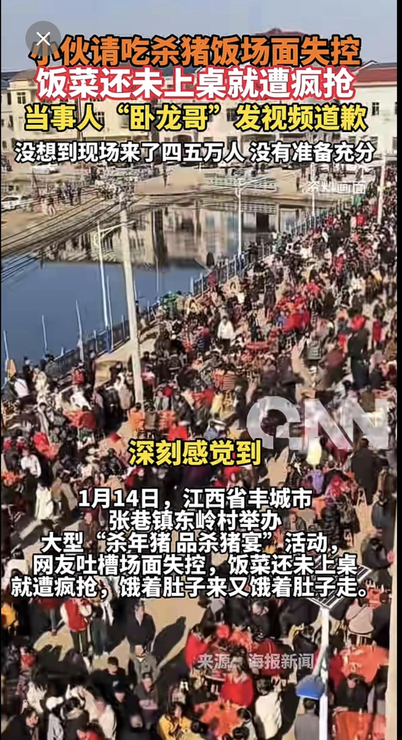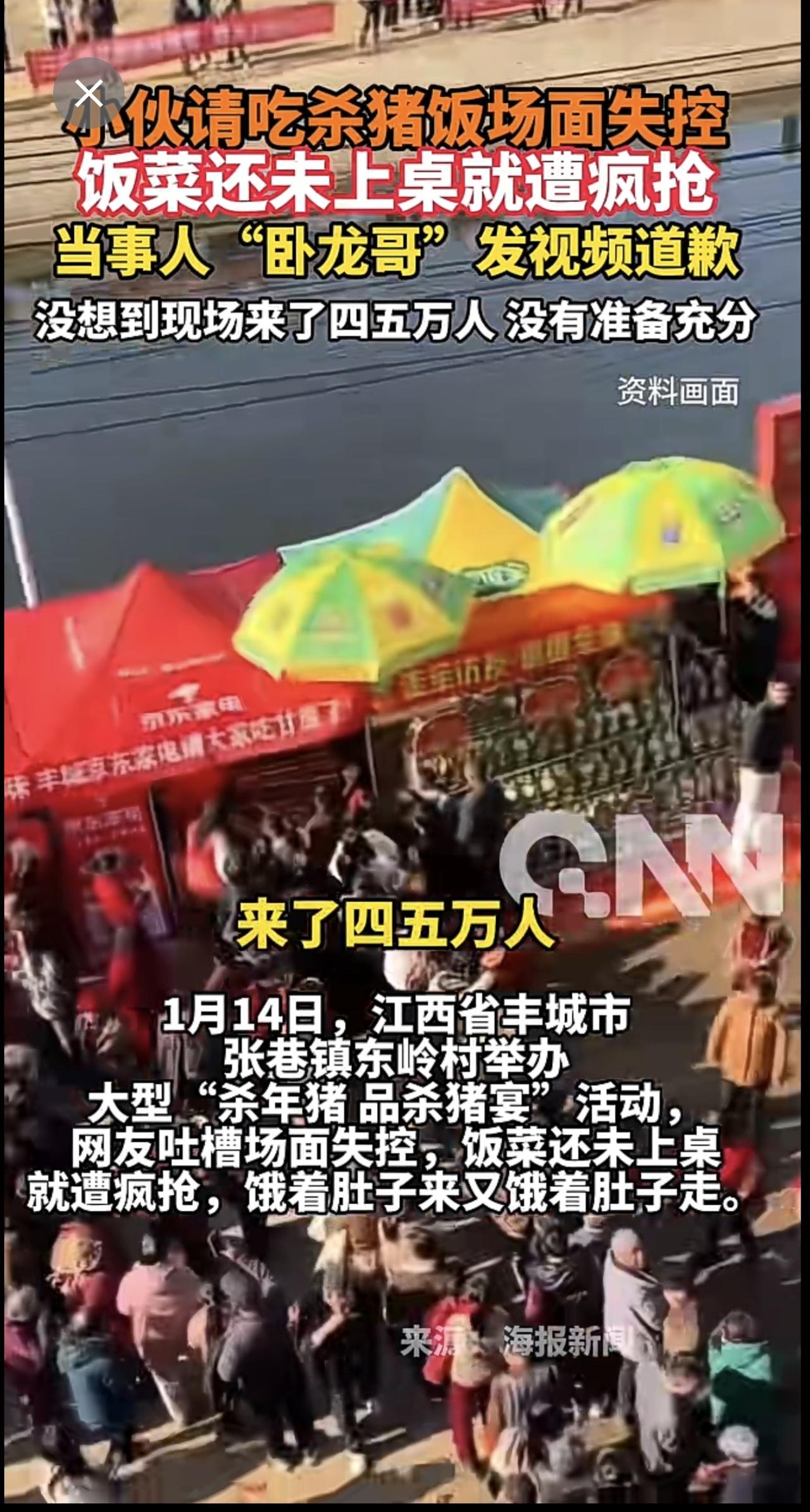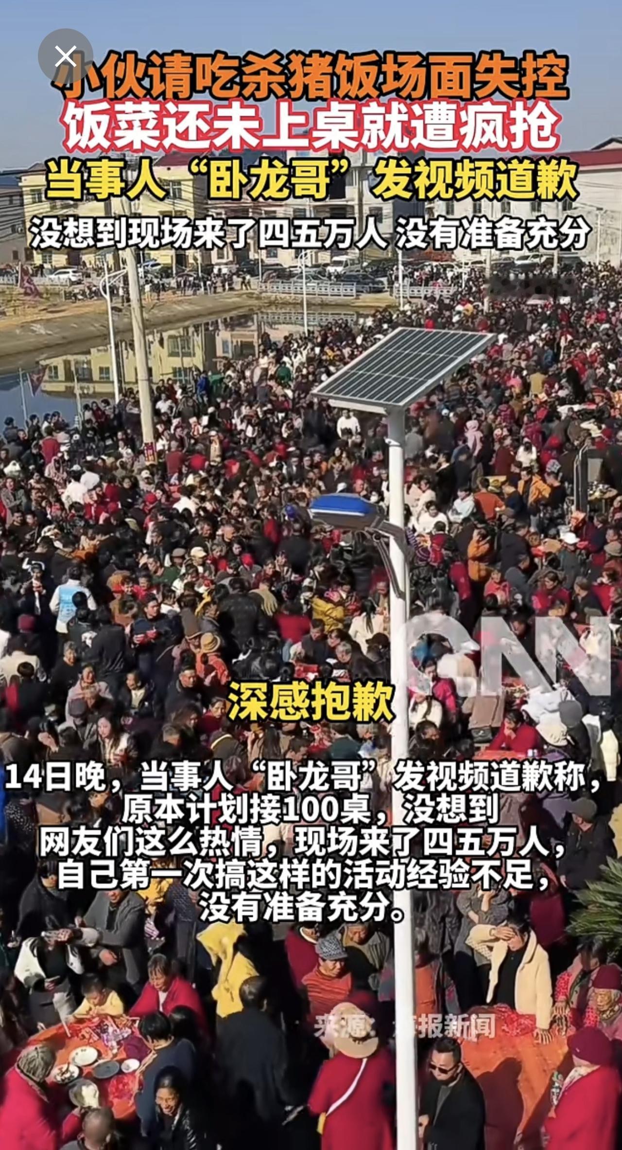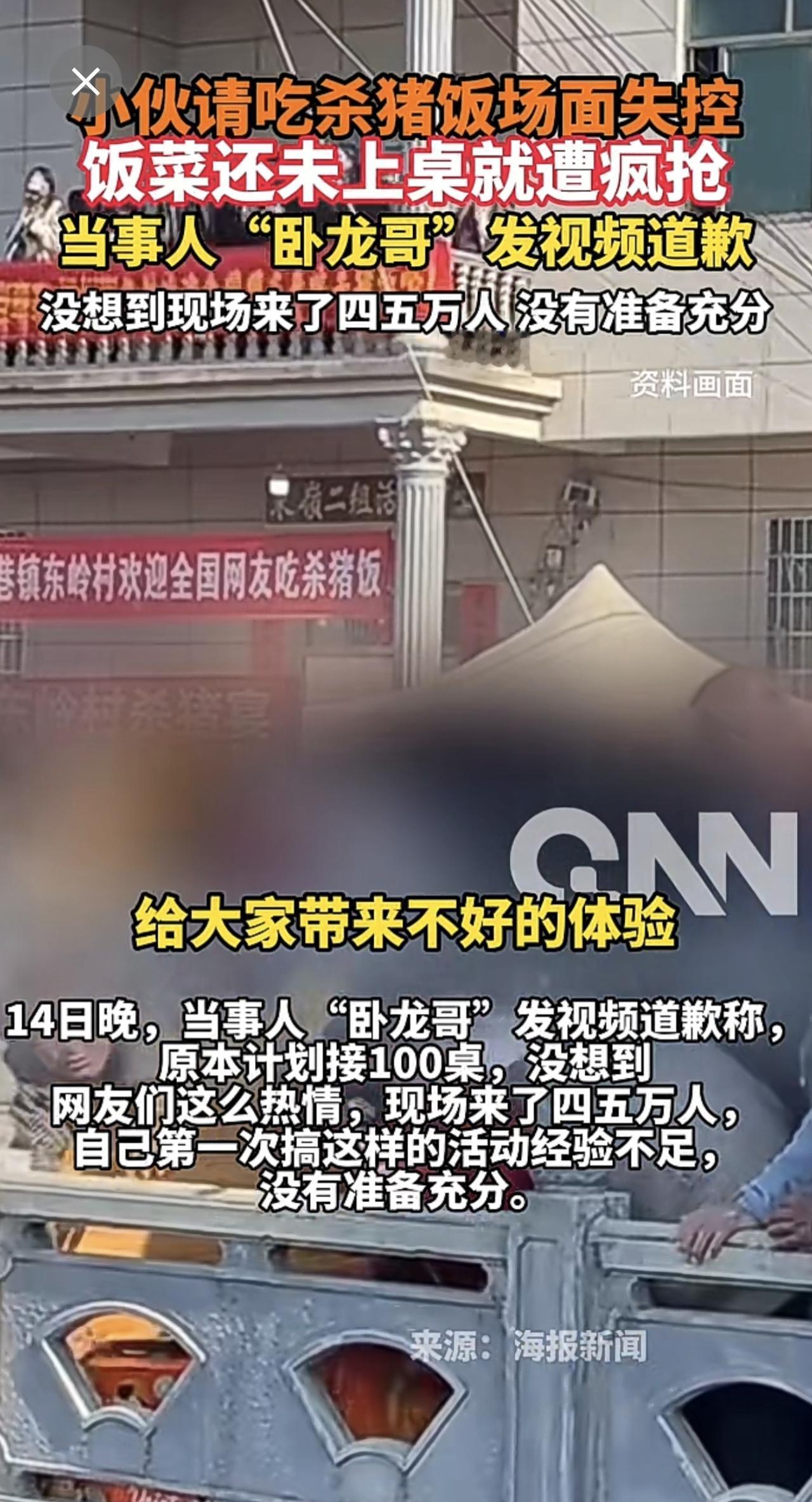 小伙请吃杀猪饭场面失控 饭菜还未上桌就遭疯抢 当事人“卧龙哥”发视频道歉 没想到现场来了四五万人 没有准备充分