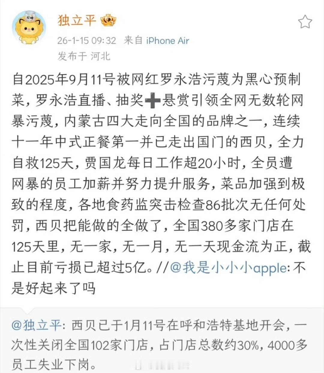 西贝迎来了自己的终局。著名博主“理记”的小号“独立平”1月15号爆料说,现在西贝已经决定,关闭全国102家门店,裁员4000人,以应对顾客下滑的危机。之所以如此,是因为自从之前与罗永浩冲突之后,西贝全国380多家门店,全都受到了巨大冲击,无一家、无一月、无一天现金流为正,总亏损金额已经超过5亿。 虽然中间有消息传出来说,西贝情况略有改善,可实际上并非如此,现在整个西贝经营依旧惨淡。 看到这里,不由得叹息一声,可以说,西贝终于迎来了自己的终局。 不得不说,罗永浩的威力实在是强大,仅仅只是一句吐槽,就让这个之前无比红火的连锁餐厅遭遇了这样的局面。 但,也需要看到,其实西贝之所以如此,西贝老板贾国龙也要付很大责任,在罗永浩发出吐槽后,他第一时间选择的竟然是硬刚,说自己的餐厅100%没有预制菜,而后更让麾下所有餐厅都开放后厨、搞直播,这样一下子不仅没有平息局面,反而暴露出了更多的问题,让顾客对西贝的观感大为下降,口碑可以说直接败光了。 其实,严格来说,西贝的餐品是符合相关规定的,西贝更提供了成千上万的就业岗位,但是西贝这一次暴露出来的问题也更大,糟糕的后厨,高昂的价格,预制菜,这几者搭配在一切,是大众根本无法接受的,西贝现在迎来这个结局,几乎可以说是一种必然。 西贝的遭遇,给所有餐饮行业敲响了警钟,只有真心实意对待顾客,才能得到欢迎,但若是敷衍对待,必将迎来非常惨淡的结局。也希望这一次西贝能够吸取教训,改正自己的缺点,诚心认错,踏实改进,这样,西贝或许还有一丝生机。