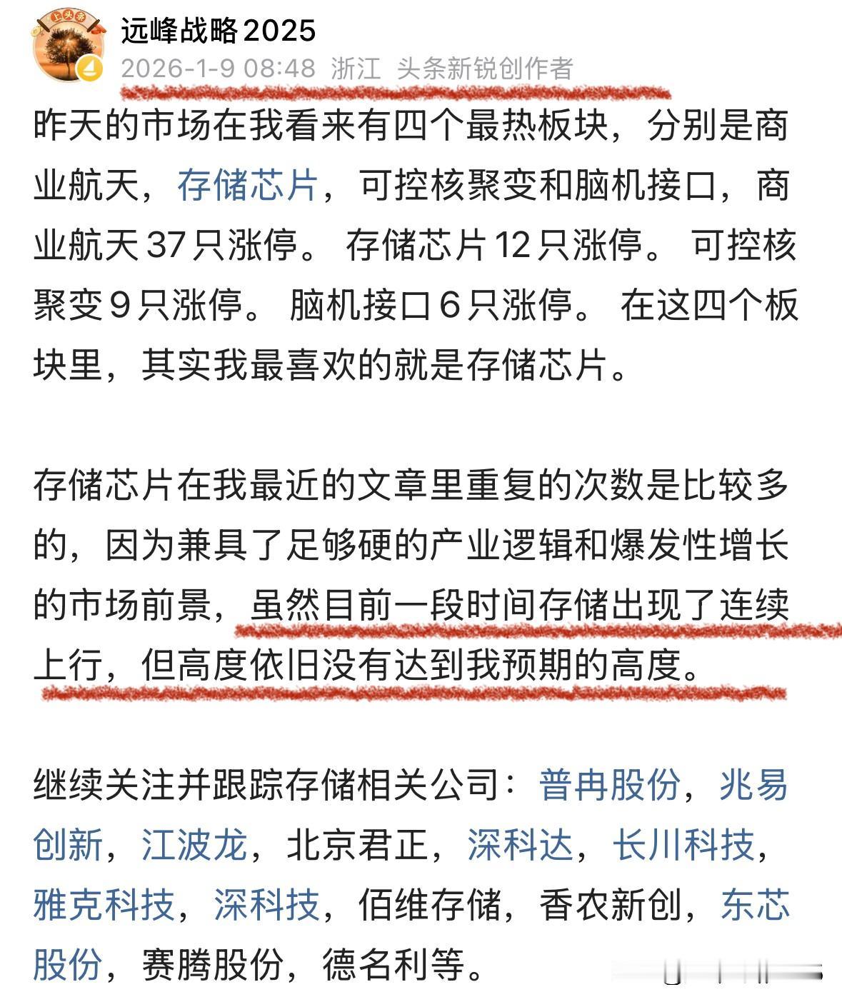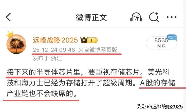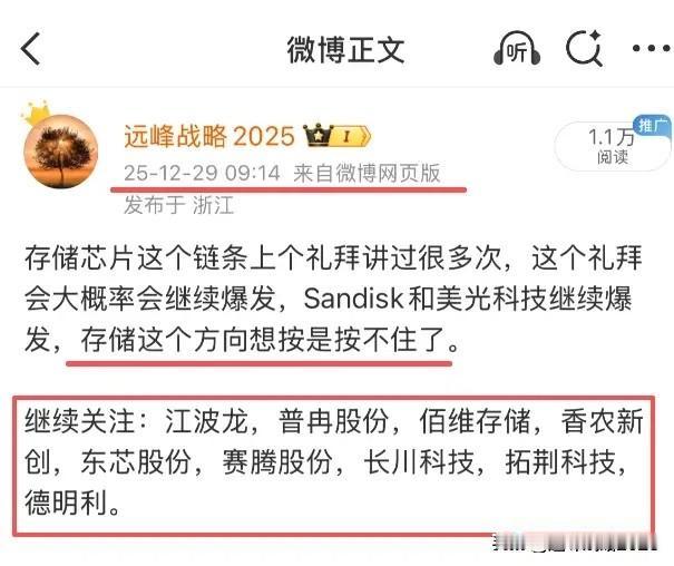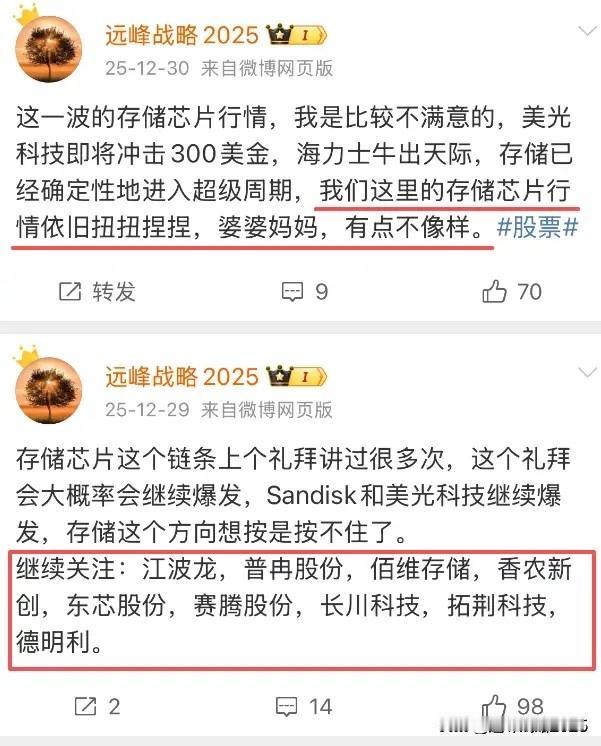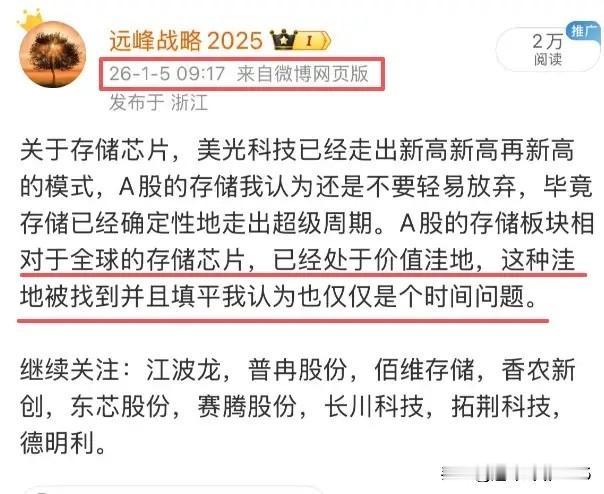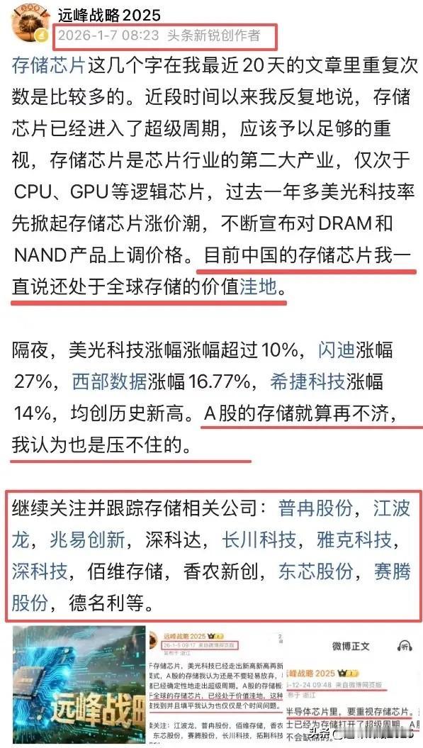 存储芯片已经进入超级周期,我认为一定要重视,这一两个月,市场对于存储芯片板块是有偏见的,迟迟不见大资金押注。 最近一阶段我一直在重复存储芯片的重要性,我认为压是压不住的,从佰维存储的公告来看,的确已经验证了存储已经进入了超级周期。 过去我说过目前寄希望于国内的存储芯片,以及半导体代工及设备,材料我认为是没有错的。如果这样的逻辑都错了,那一定不是我错了,而是市场的资金和大户的认知出了问题。 继续关注并跟踪存储相关公司:普冉股份,兆易创新,江波龙,北京君正,深科达,长川科技,雅克科技,深科技,佰维存储,香农新创,东芯股份,赛腾股份,德名利等。