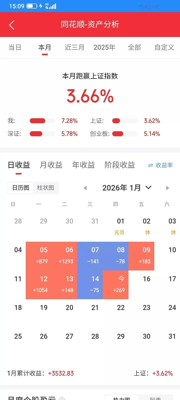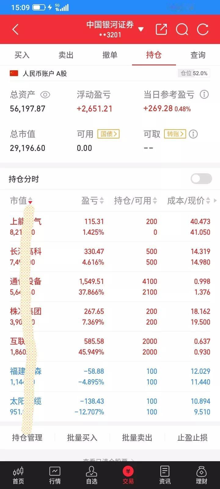 2026.01.15,今天上证指数低开反弹然后继续下跌,下午又反弹拉起来了。今天没有严格执行交易系统,而且交易系统也还有些缺陷,修改一下,今后破板的阳线不再购买,踏空也比较难受,还是留一点底仓,同时红进绿出,网格交易也有致命缺陷,上涨的时候很快就卖完了,下跌的时候很快就满仓了,放弃网格交易计划,今后全部红进绿出,保留底仓,没有底仓的早盘买入100股,当天收盘上涨就再加仓,下跌就不再补仓,保留底仓。错了及时修正错误。 今天下跌的时候恐慌过度,在底部割肉止损了很多。 早上太阳低开低走,大幅下跌,又买错了,今后破板阳线不买,下跌中以9.65卖掉100股,卖掉之后继续下跌,估计今天要收阴线了,收盘肯定要卖,还是提前卖吧,下跌中以9.50再卖掉100股,卖掉之后下跌了一点点,又反弹了,留下100股作为底仓。 金森也是一样的,继续下跌,还好前几天卖掉了,昨天买入不多,买错了,下跌中以11.50卖掉100股,留下100股做底仓,收阳线的时候补仓。 通信设备etf大幅低开下跌,昨天又买错了,估计收盘会收阴线,先卖掉算了,下跌中以1.350卖掉1000股,打算留下2000股作为底仓,但是卖掉之后就不下跌了,下午还反弹拉出阳线,急忙以1.372买回来2000股,成交之后又下跌了一点点,还是买贵了。收盘虽然下跌,也是假阳线。就不再补仓了。 互联网etf也是差不多,一直心存幻想,舍不得卖,预估收盘会收阴线,放弃网格交易了,还是先卖掉吧,下跌中以0.933卖掉6800股,留下2000股做底仓,今后还是红进绿出,不再使用网格交易。 昨天清仓了上能,早上低开,于是以39.90买入100股,符合预期,收盘收出阳线,收盘前以41.04又补仓买回来100股,比昨天卖出价还要高,但是还是按照交易系统,该买就买,不在乎成本。 今天株冶还是符合预期上涨,收阳线,继续持有,直到收阴线卖出。 昨天收阳线买入的长鸿,今天也符合预期,反弹上涨,最高上涨了9个点,差一点涨停了,但是可能套牢盘太重,主力没有继续上拉,又冲高回落,收阳线,持股待涨,直到收阴线再卖。 今天持有的大部分都下跌,但是上能,株冶,长鸿上涨,抵消了亏损。今天总市值2.91万元,总资产5.61万元,今天总体账户反弹回本269元。借呗又诱惑我贷款,给了5万元免息30天,早上没有睡醒,贷款的时候少点了一个0,才贷了5千,再贷就不免息了,拿来买逆回购,一个月也能挣几十块钱,又错过了,就贷5千,挣几块钱算了。