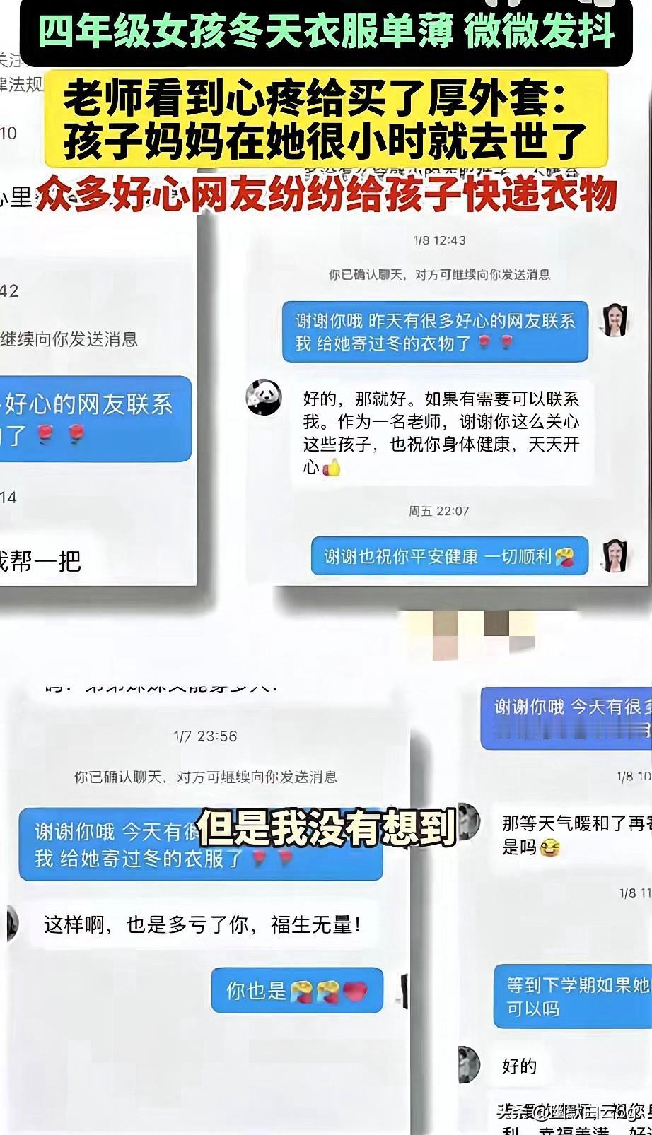 被云南这位英语老师的温柔狠狠戳中!核心思路是聚焦“善意的连锁反应”,跳出单纯的爱心叙事,突出“一个小举动撬动全网温暖”的独特视角,用口语化表达传递治愈感。 谁能拒绝这样的温柔传递!云南这位小学老师,真的把“为人师表”活成了光! 下雪天看到四年级女生衣着单薄冻得发抖,得知孩子从小没妈妈,老师又心疼又着急,不仅买了厚外套,还拍下背影求助网友。 没想到善意一呼百应!网友们的包裹堆成了小山,棉衣、棉鞋、贴身衣物样样齐全,还有人主动要资助学费。 更戳人的是,老师没让爱心浪费,征得同意后把多余物资分给了另外两个贫困生,让一份温暖变成了三份快乐。 其实善良从不是孤军奋战,而是一个人点燃火种,千万人添柴加薪。老师的细心、网友的热忱,让这个冬天不再寒冷。 这世上最动人的,就是陌生人之间毫无保留的善意接力。你有没有被这样的温暖瞬间打动过?来评论区说说~