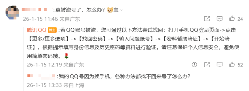 有网友在辟谣声明下留言,“真被盗号了,怎么办?宝~”,腾讯QQ对此回复,“若QQ账号被盗,您可通过以下方法尝试找回:打开手机QQ登录页面->点击[更多/更多选项]->[找回密码]->[输入问题账号]->[资料辅助验证]->[开始验证],根据提示填写身份信息及历史密码等资料进行验证。请注意保护个人信息安全,避免使用简单密码哦。”