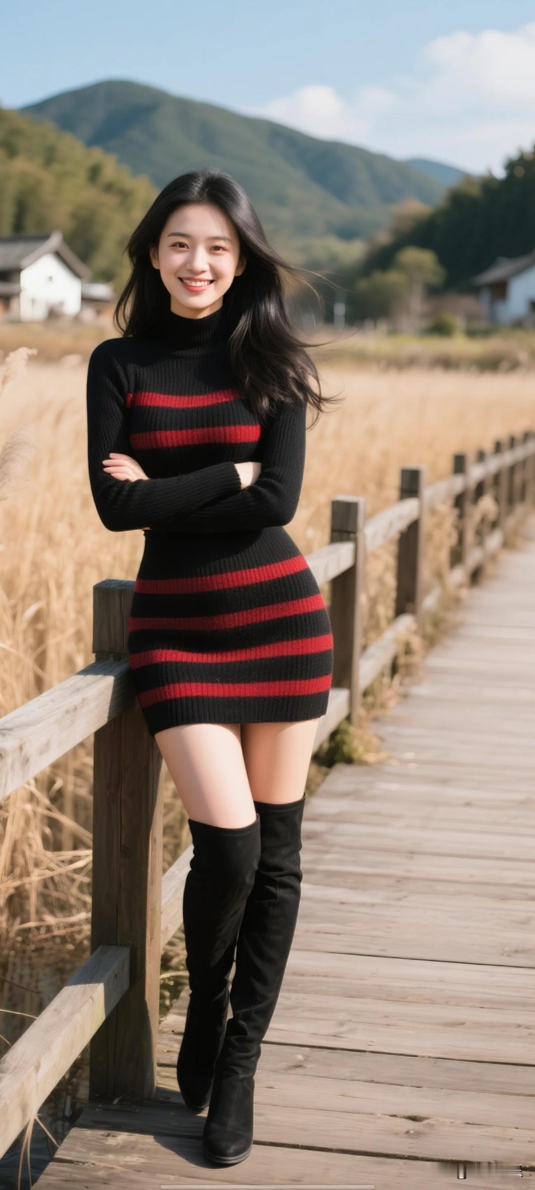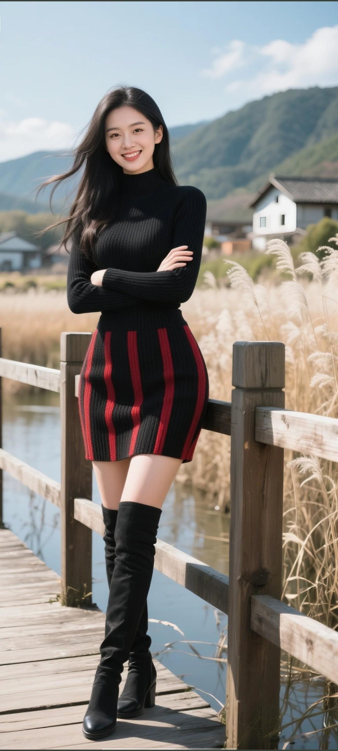 人像摄影咋摆姿势,优雅好看?舒适美丽穿搭 美女,甜美,身材火辣傲人,大上围挺拔饱满,沙漏型身材,鹅蛋脸,面部轮廓柔和圆润,唯美迷人,注视着镜头浅笑,苹果肌自然隆起,下颌线流畅,杏眼,眼型圆润饱满,眼神明亮灵动,眼尾微扬,自然柔和弯眉,眉峰弧度平缓,鼻型小巧精致,山根适中,鼻翼窄,皮肤白皙细腻,白开水伪素颜妆,娇憨神态,甜美清新风格,风吹发丝飘动,阳光洒脸,光影自然,头部、身体及手脚姿势,头部正对镜头、有侧面的、身体倚靠木质围栏站立(双臂交叉)、双腿交叠,黑色长发,柔软羊毛长袖上衣,黑红条毛织短裙,过膝长靴,户外,湿地木质栈道、大片枯黄芦苇丛、背景青山(植被覆盖)、村落建筑、蓝天白云,完美身材,神情温柔羞怯,超广角镜头,远景,全身照