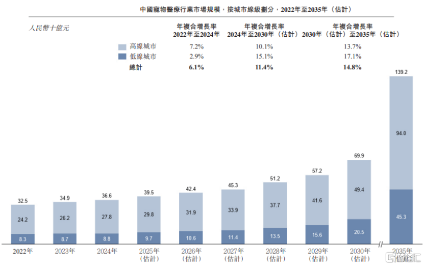 2024年宠物医疗行业规模达到366亿元,预计到2030年及2035年分别增长至699亿元、1392亿元,年复合增长率为11.4%及14.8%。