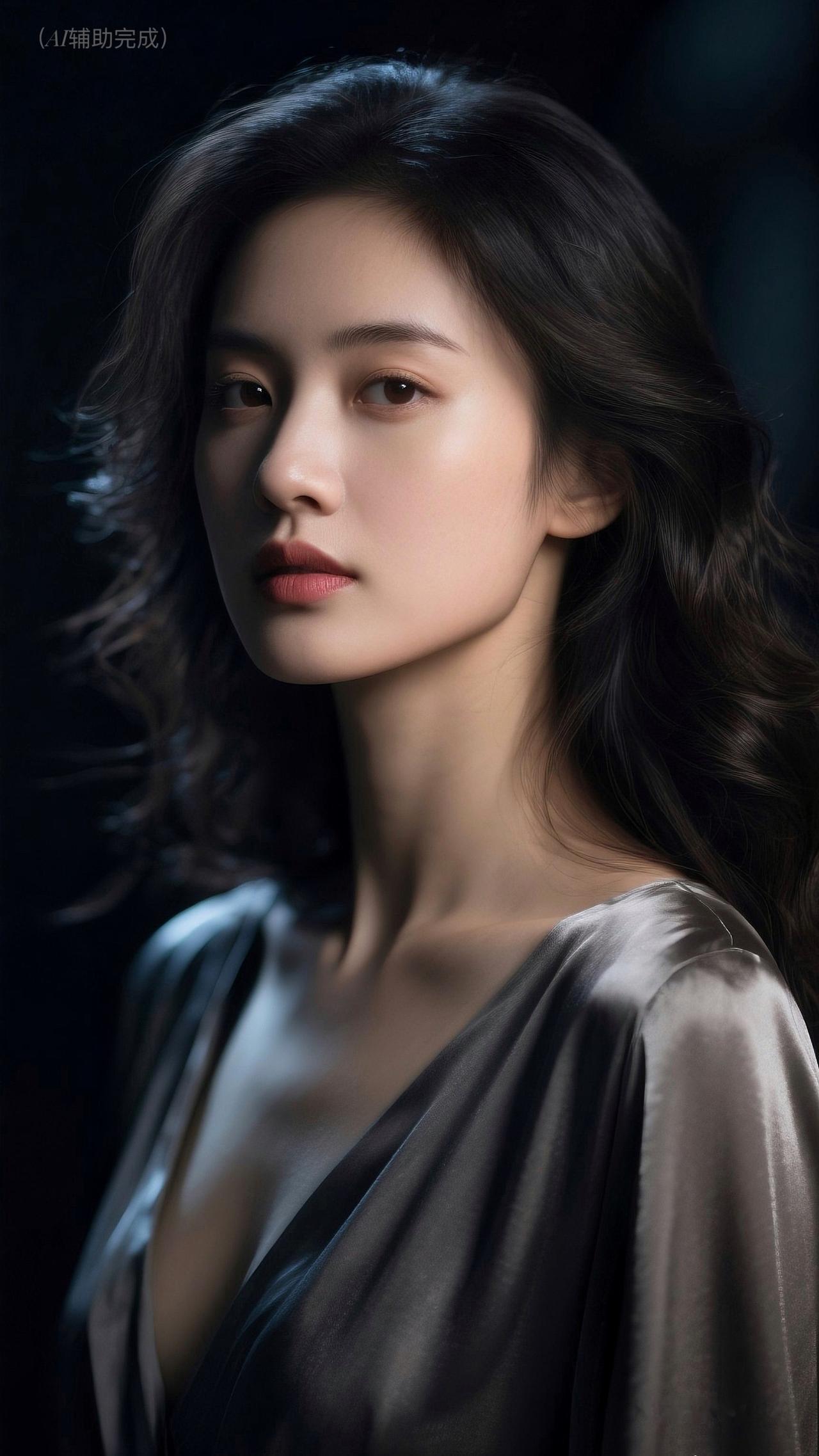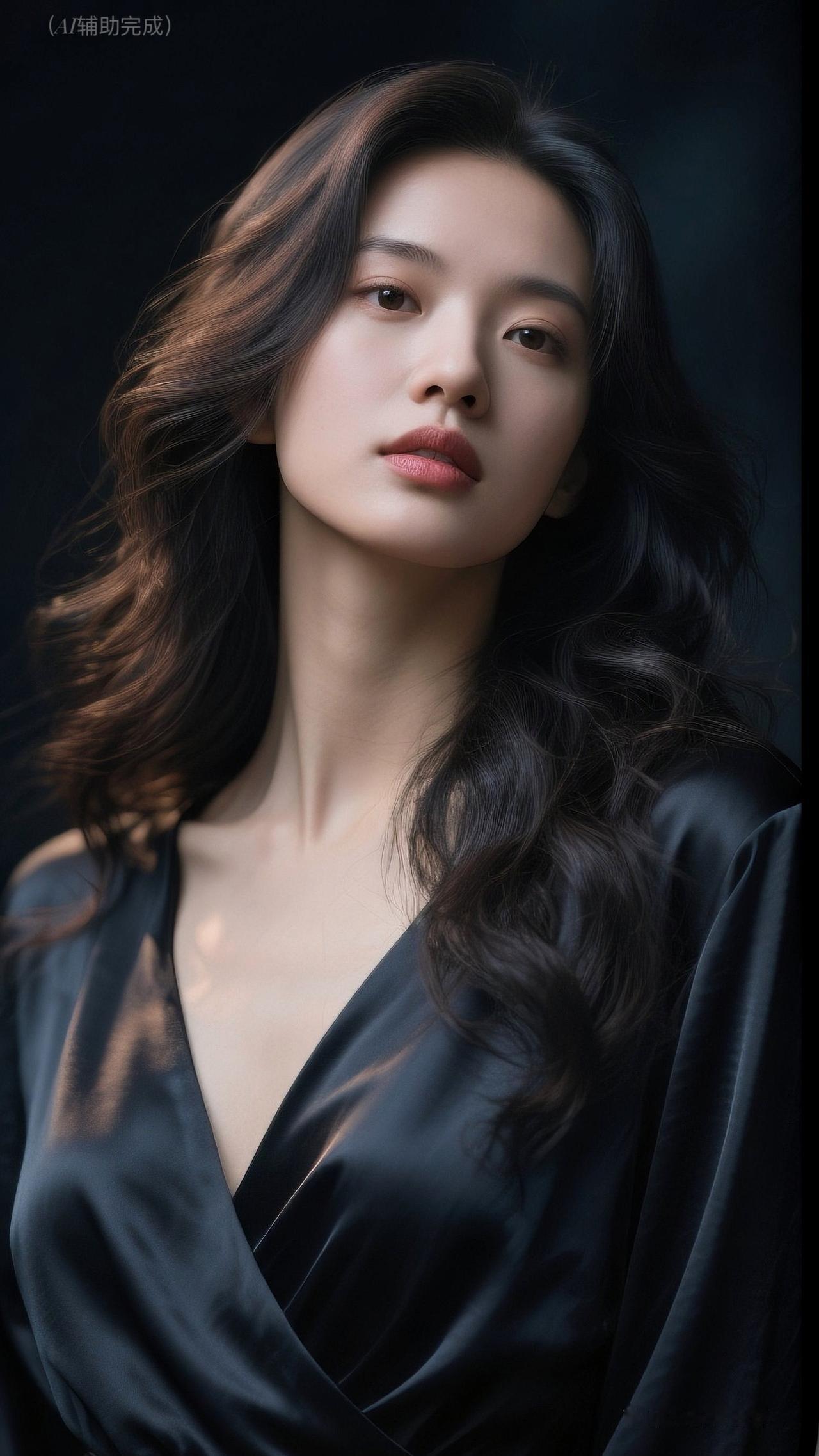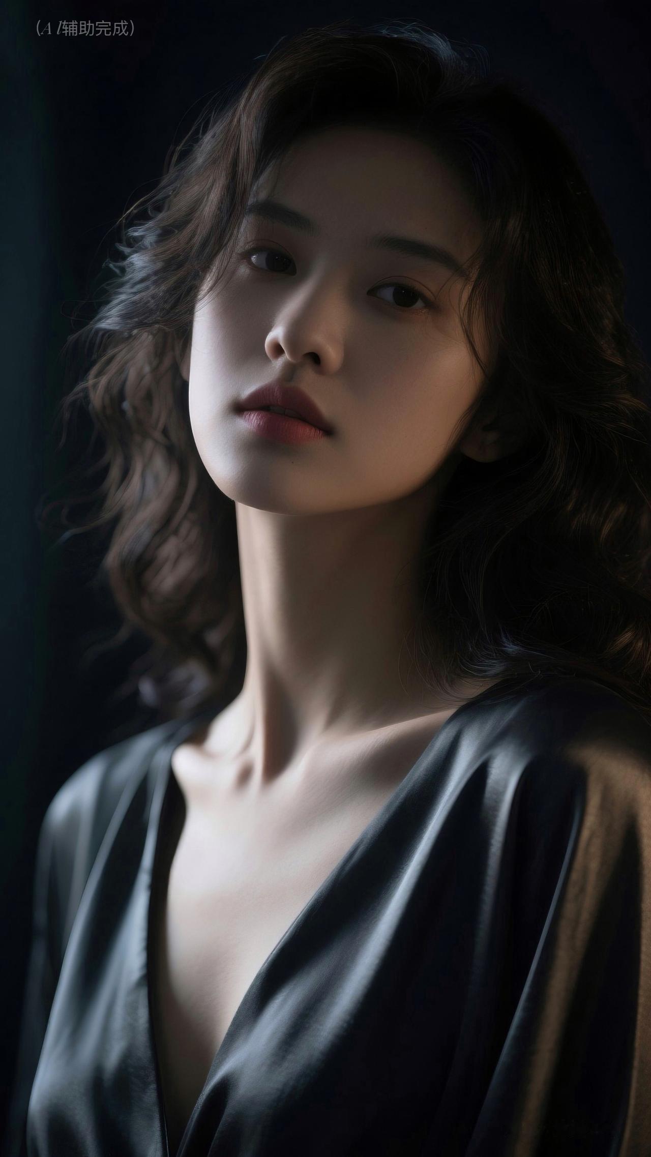 乌发卷曲垂肩泛柔光,深V绸缎裹身显雅韵。暗调背景衬红唇亮眼,柔光勾勒精致侧颜,眸藏星子静如诗。神秘优雅漫开静谧境,这帧暗夜美人,一眼沦陷!