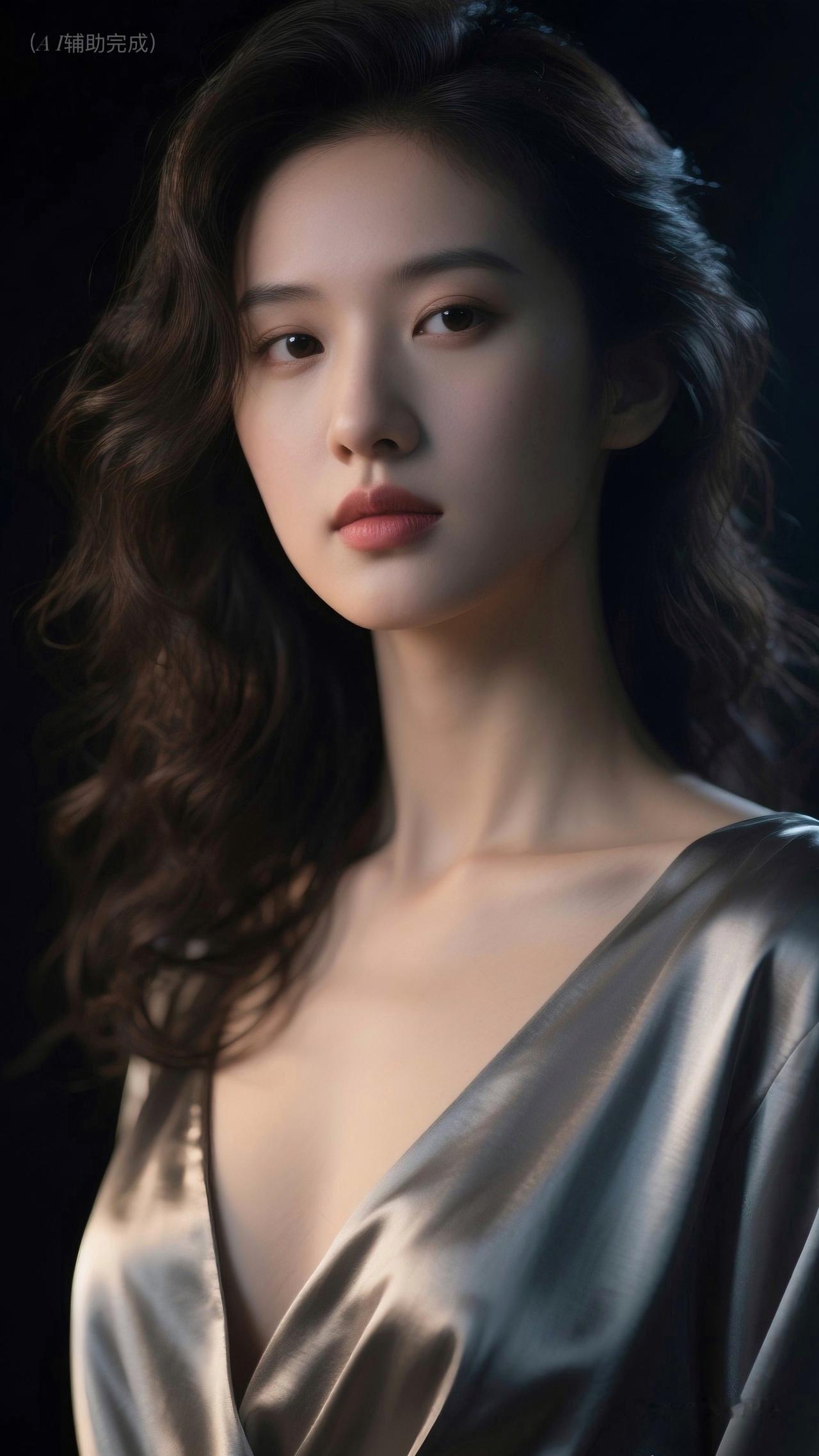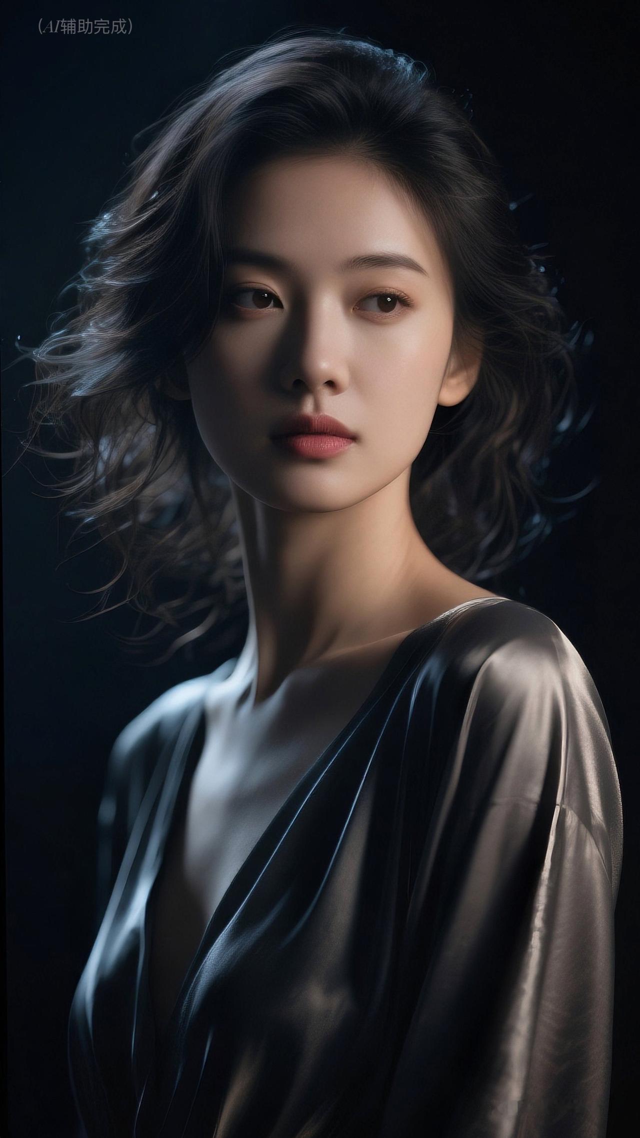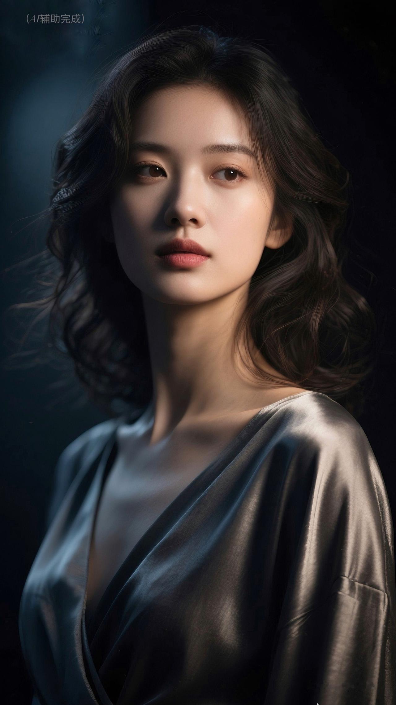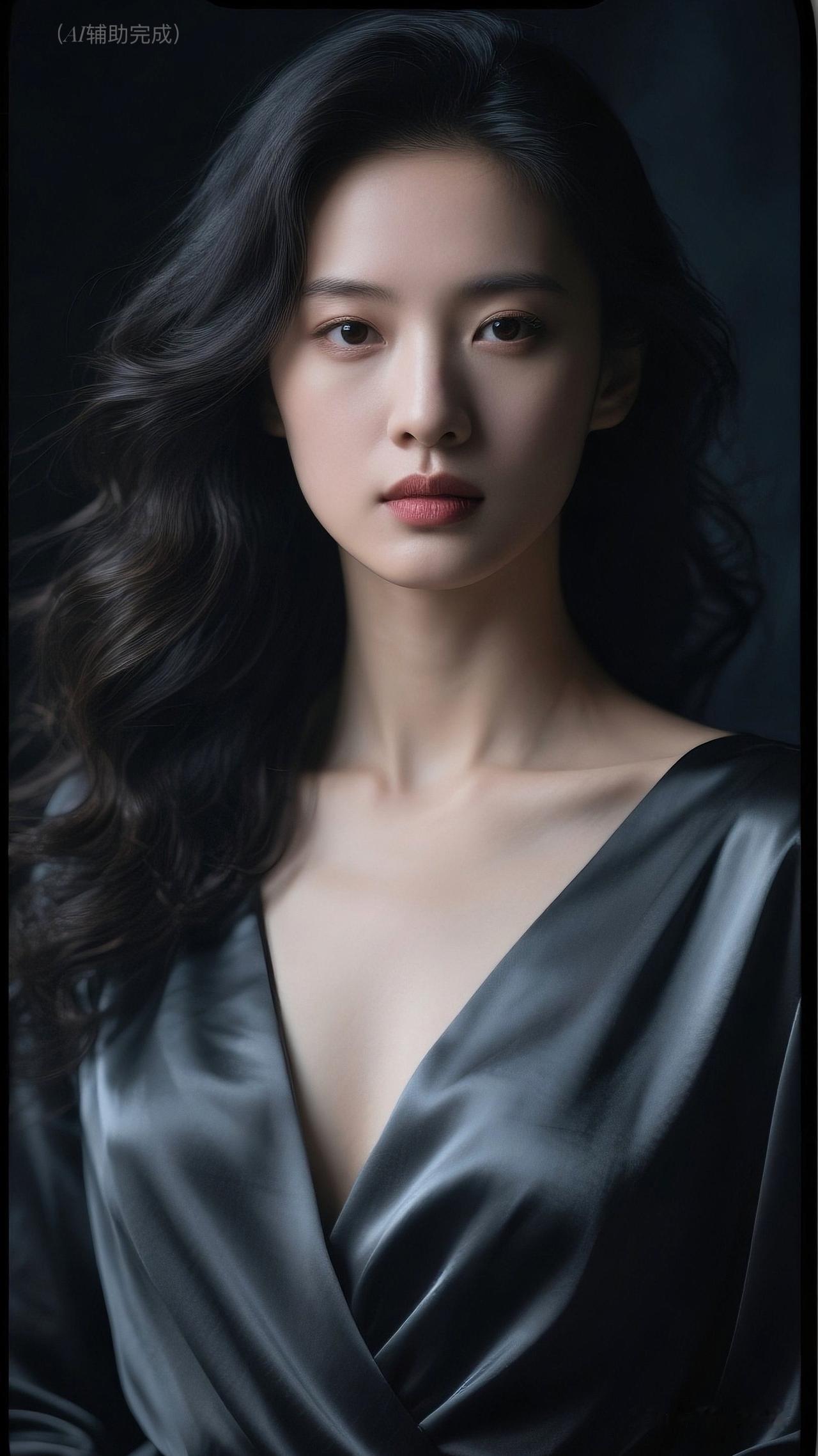 乌发卷曲垂肩泛柔光,深V绸缎裹身显雅韵。暗调背景衬红唇亮眼,柔光勾勒精致侧颜,眸藏星子静如诗。神秘优雅漫开静谧境,这帧暗夜美人,一眼沦陷!
