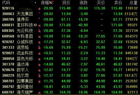 A股市场超3100股飘绿,AI应用概念大幅回调,值得买、天龙集团、光云科技等跌停;商业航天概念亦下挫,金风科技、直真科技、航天动力、中国卫星等均跌停;半导体板块午后拉升,蓝箭电子(301348)、矽电股份(301629)尾盘20%涨停,上海新阳创历史新高;有色板块活跃,四川黄金、翔鹭钨业等涨停。